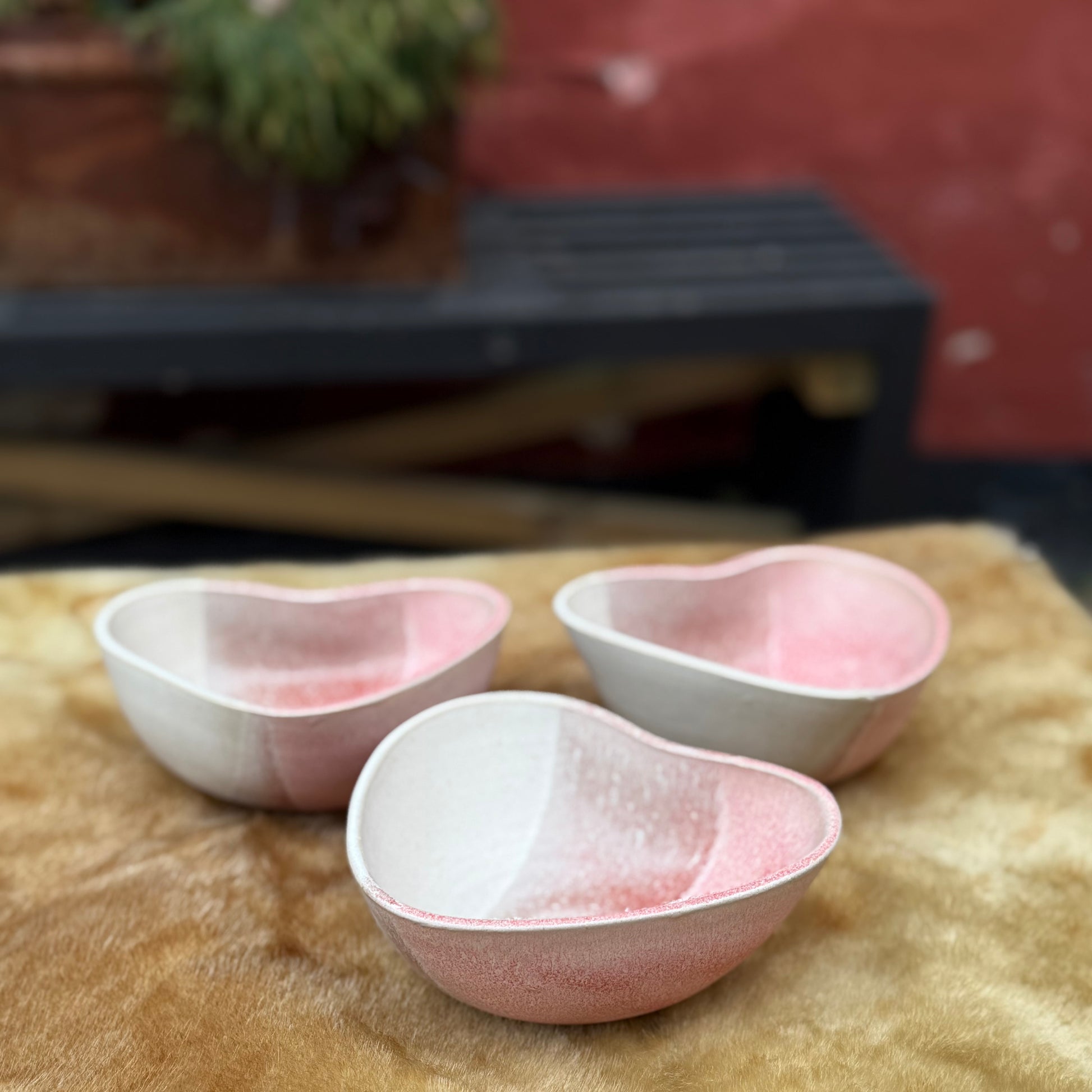 En sød og romantisk hånddrejet skål i stentøjsler formet som et hjerte. Skålene måler cirka 12-13 cm. i diameter og er ca.5-6 cm høje.