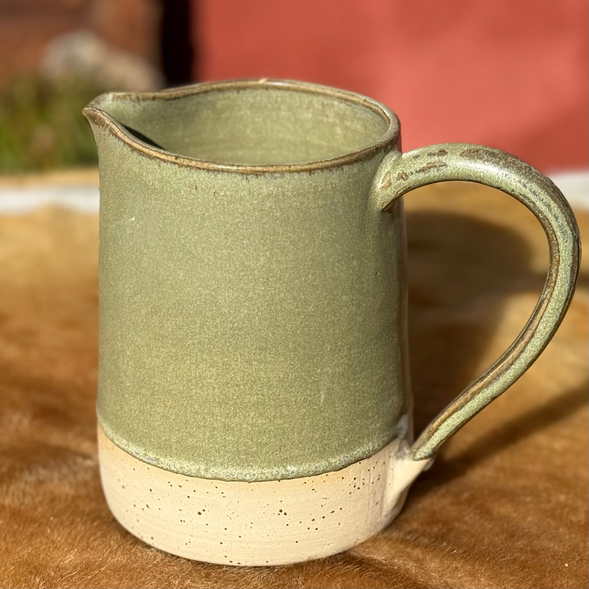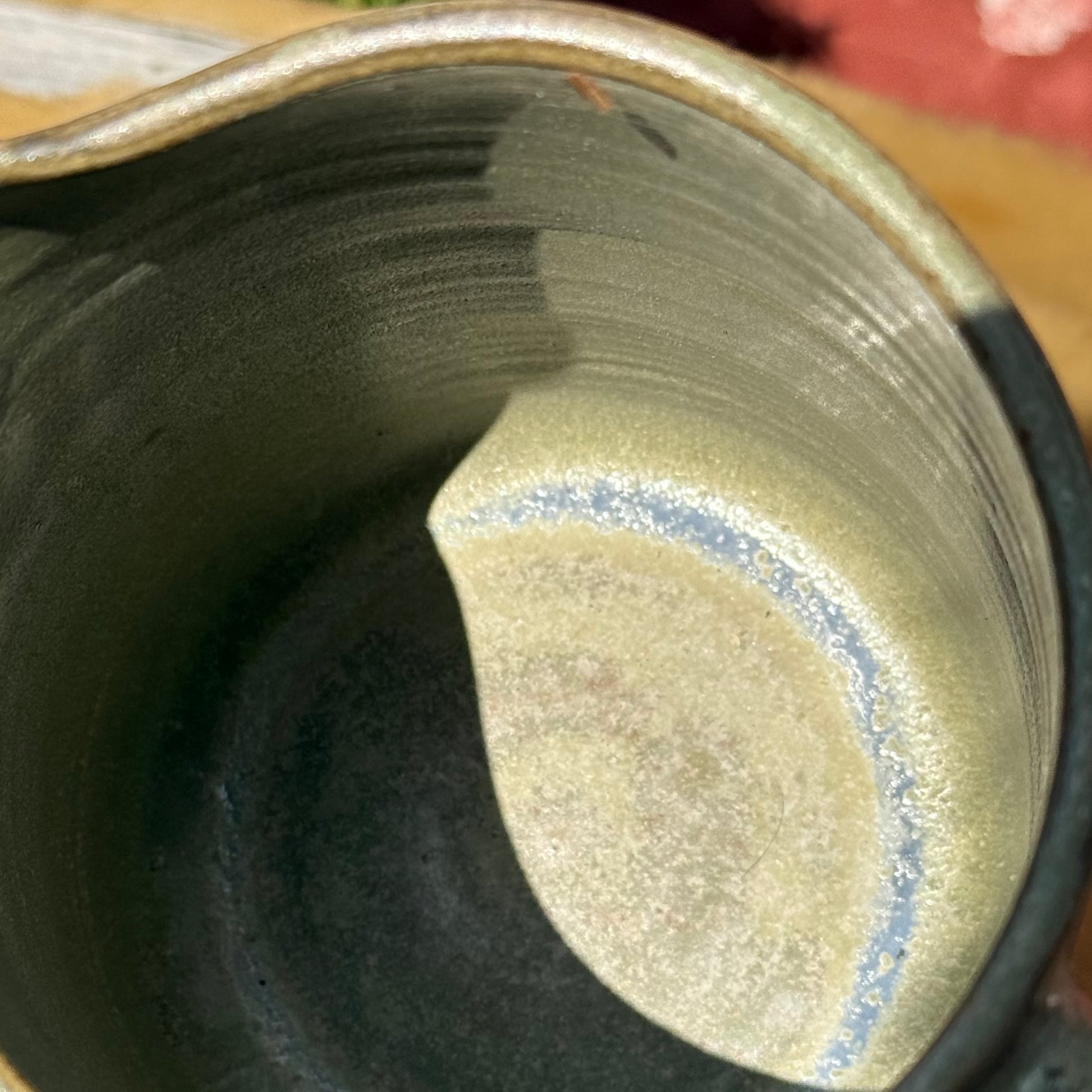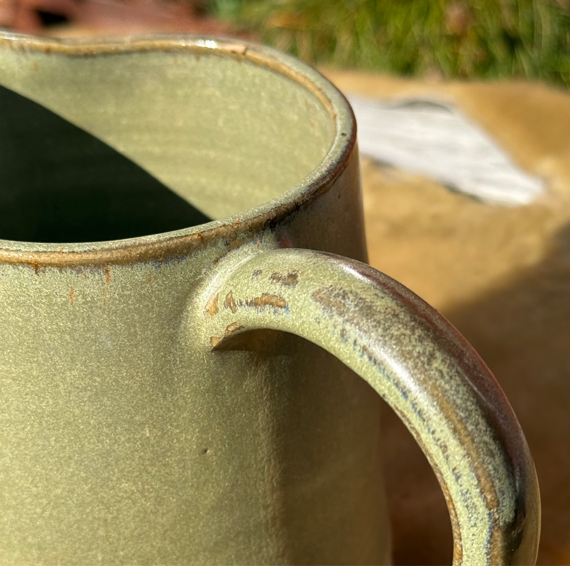 Hånddrejet lækker kande i mosgrøn halvmat med spændendende farvespil på bl.a kanter og hank. Indeholder ca. 1 l.