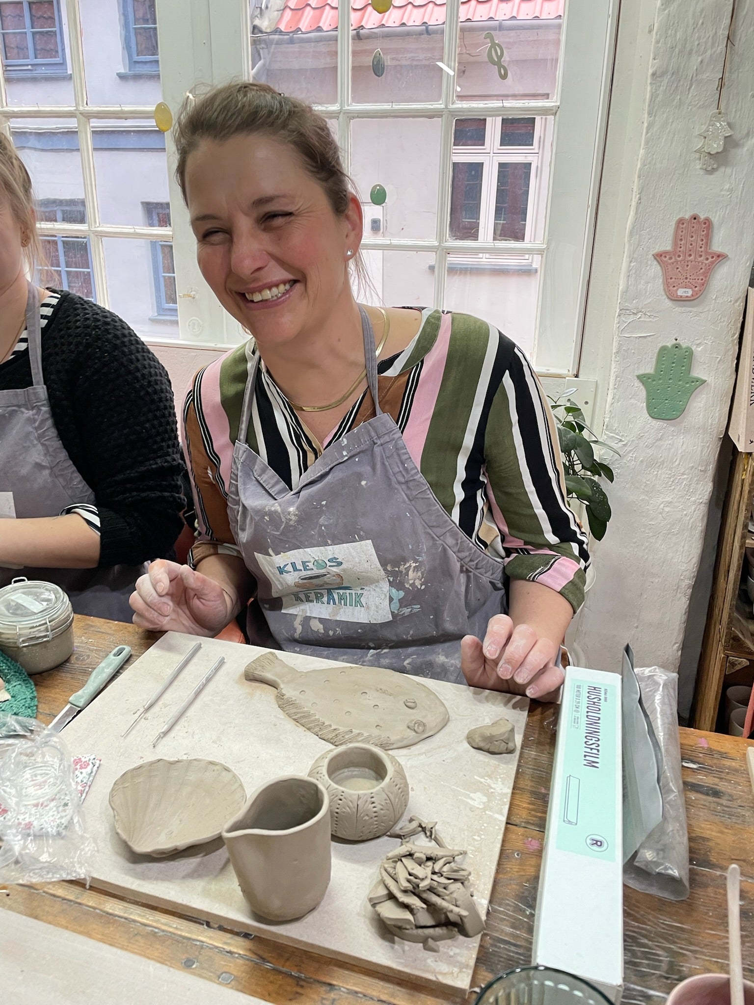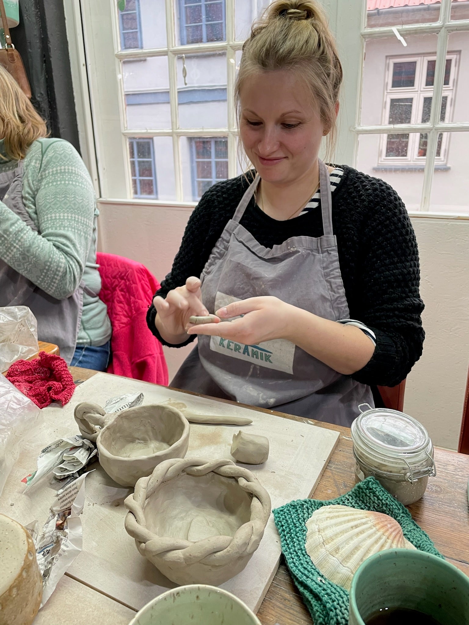 De fire første gange former vi leret, som bliver tørret og brændt til sidste kursusdag, hvor vi dekorerer og glaserer tingene inden det skal brændes igen.