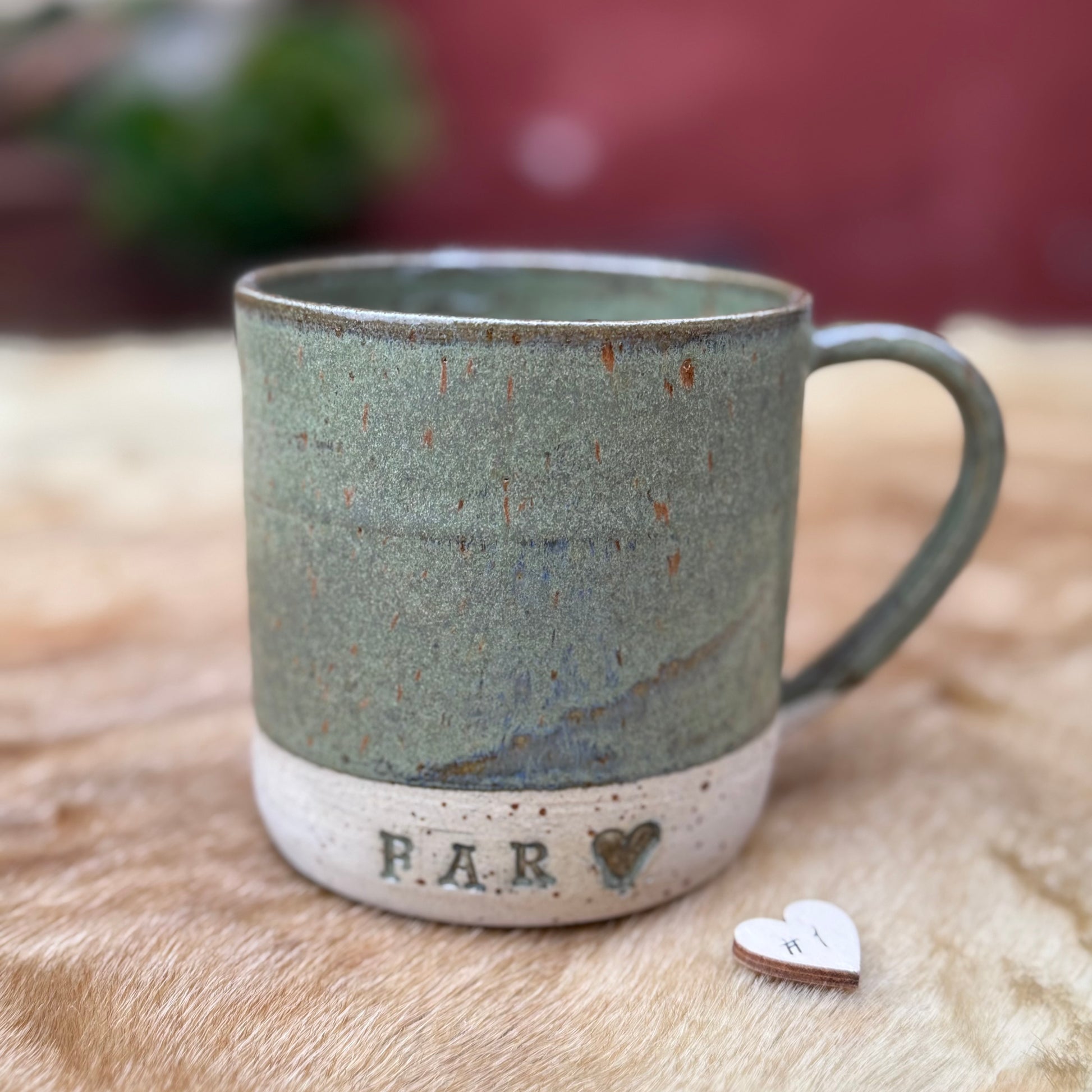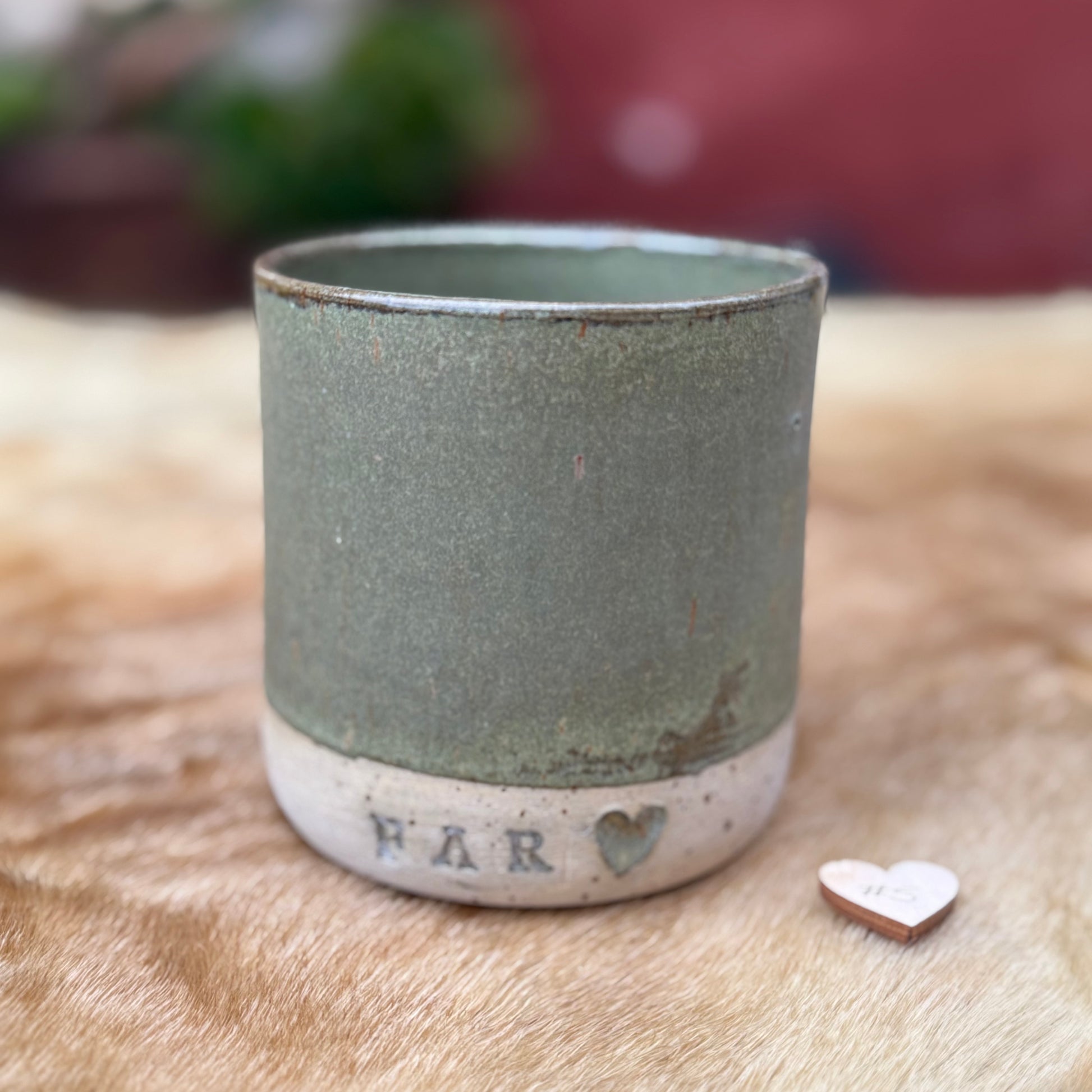 Hånddrejet krus med teksten FAR og evt. et hjerte efter og med eller uden hank. Krusene er lavet i stentøjsler og kan indeholde cirka 3 dl. væske.