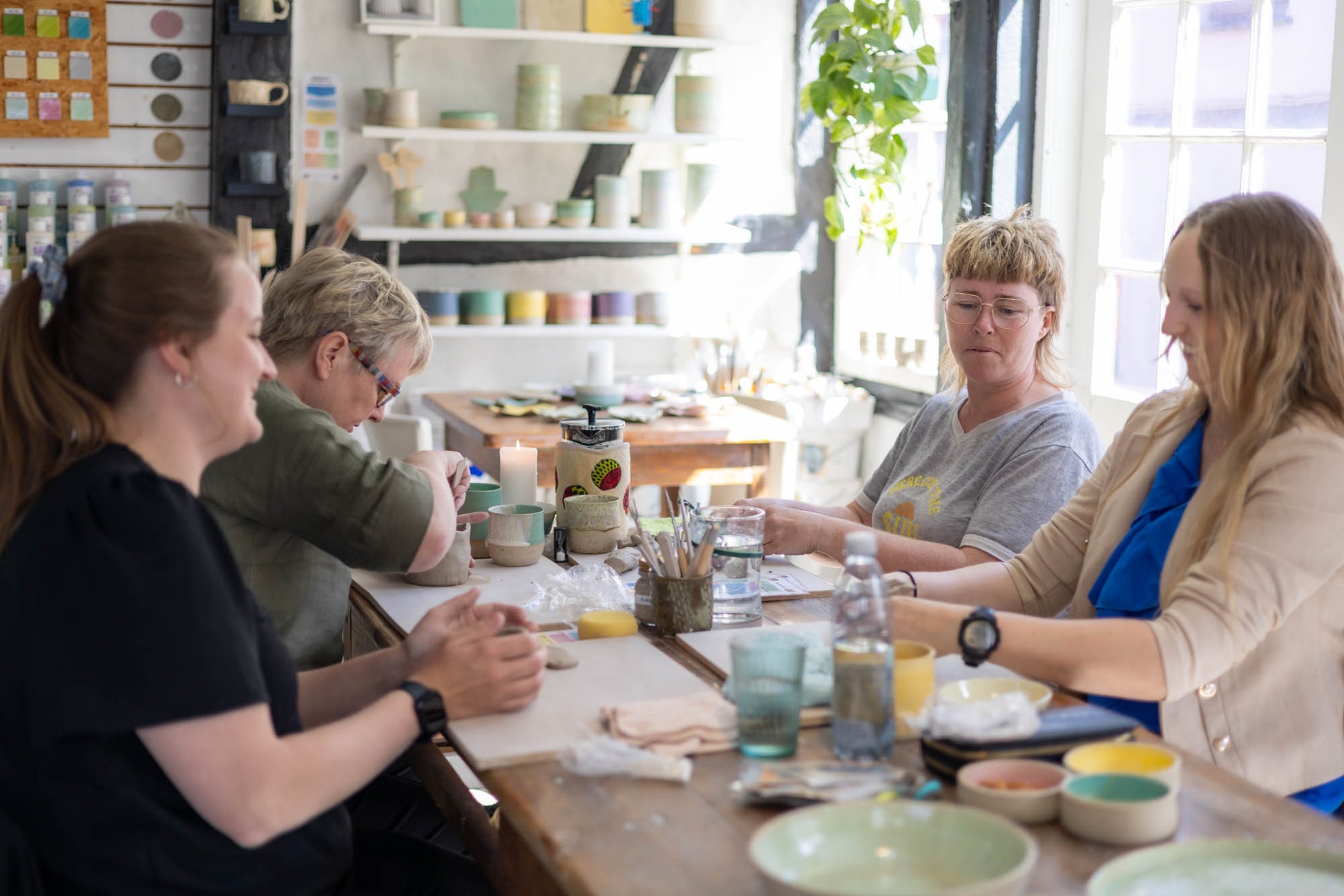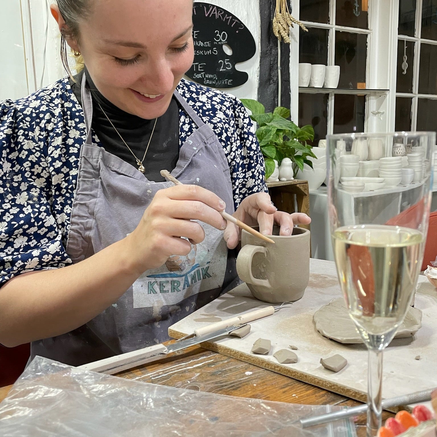 Tilbring en hyggelig aften i det charmerende værksted med ler mellem fingrene og et glas bobler. Tag din veninde, bror, ven, søster, mor eller far med.