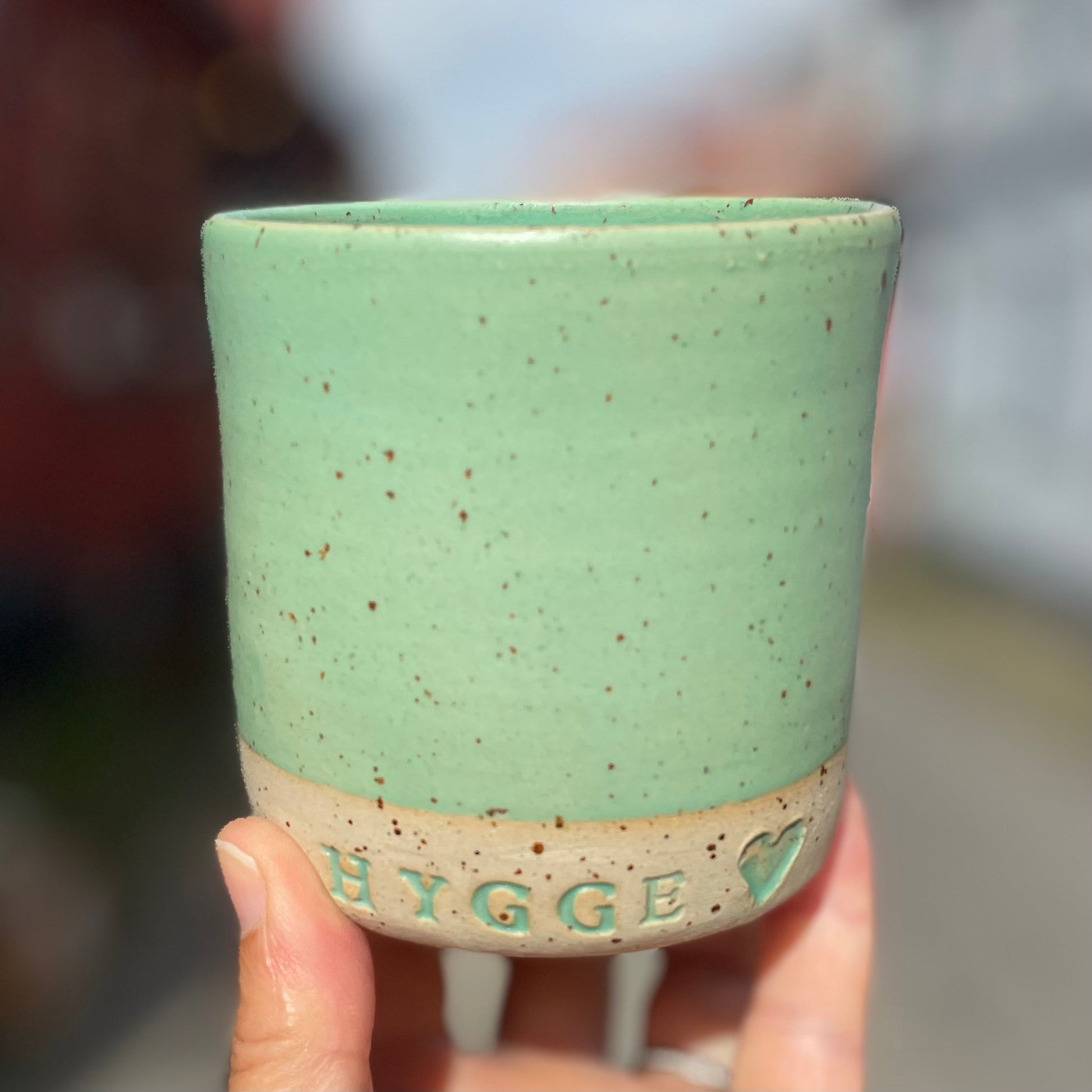 Hånddrejet krus lavet i stentøjsler med små pletter.