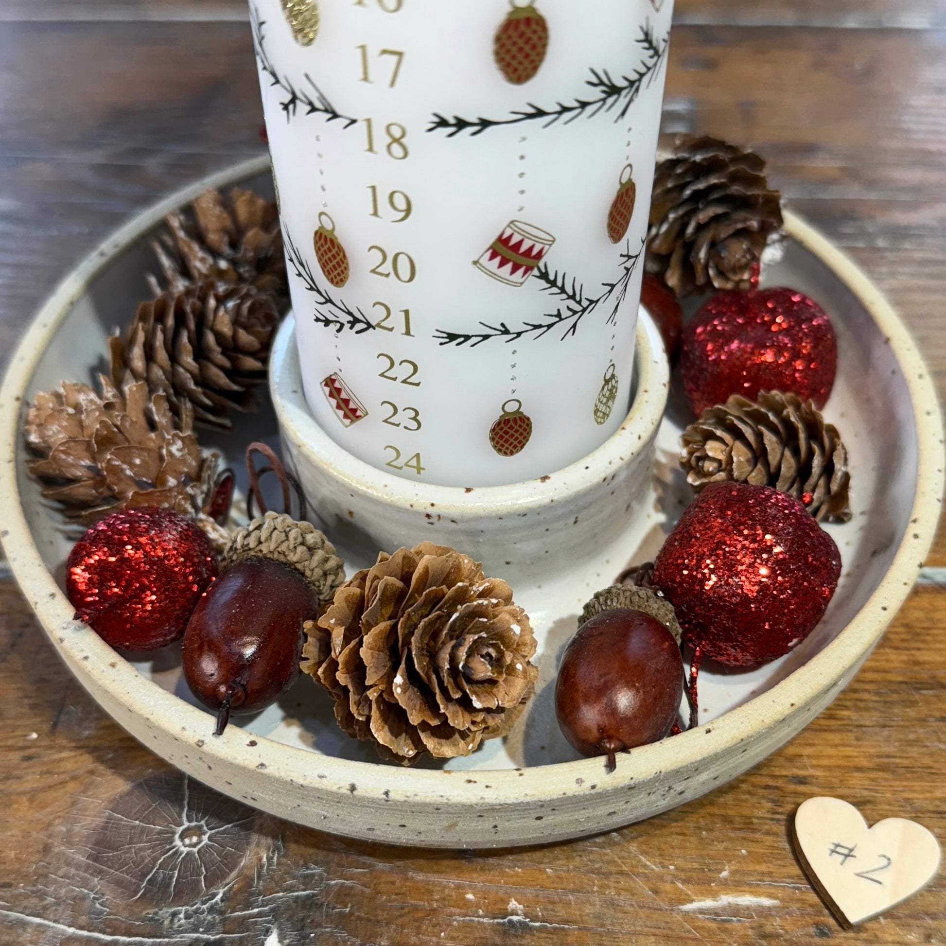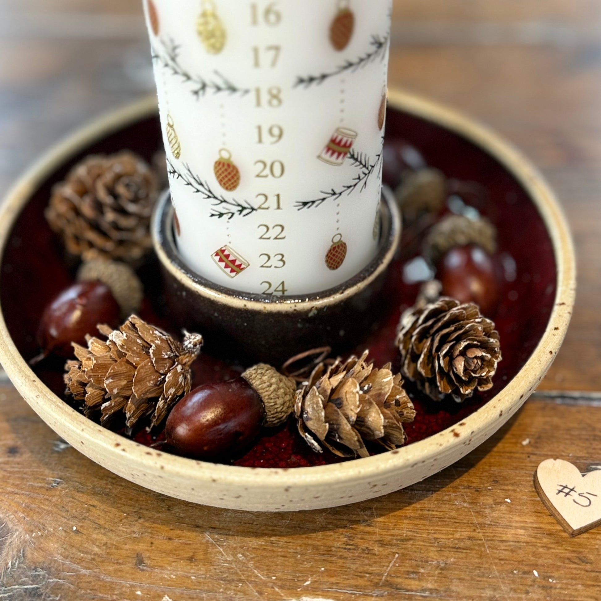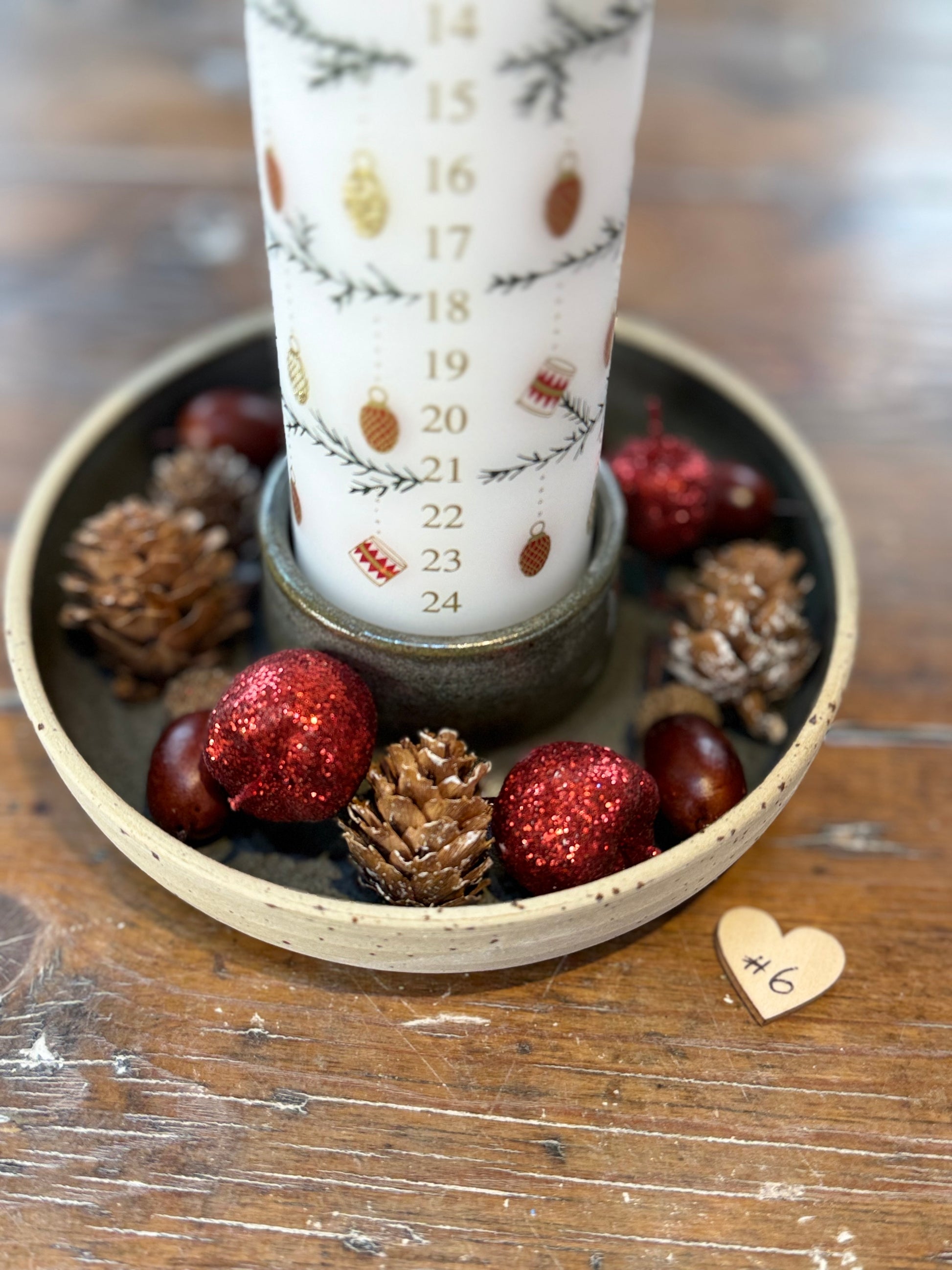 Lysestager til kalenderlys hvor der er plads til lidt dekoration rundt om. Lavet i stentøjsler.