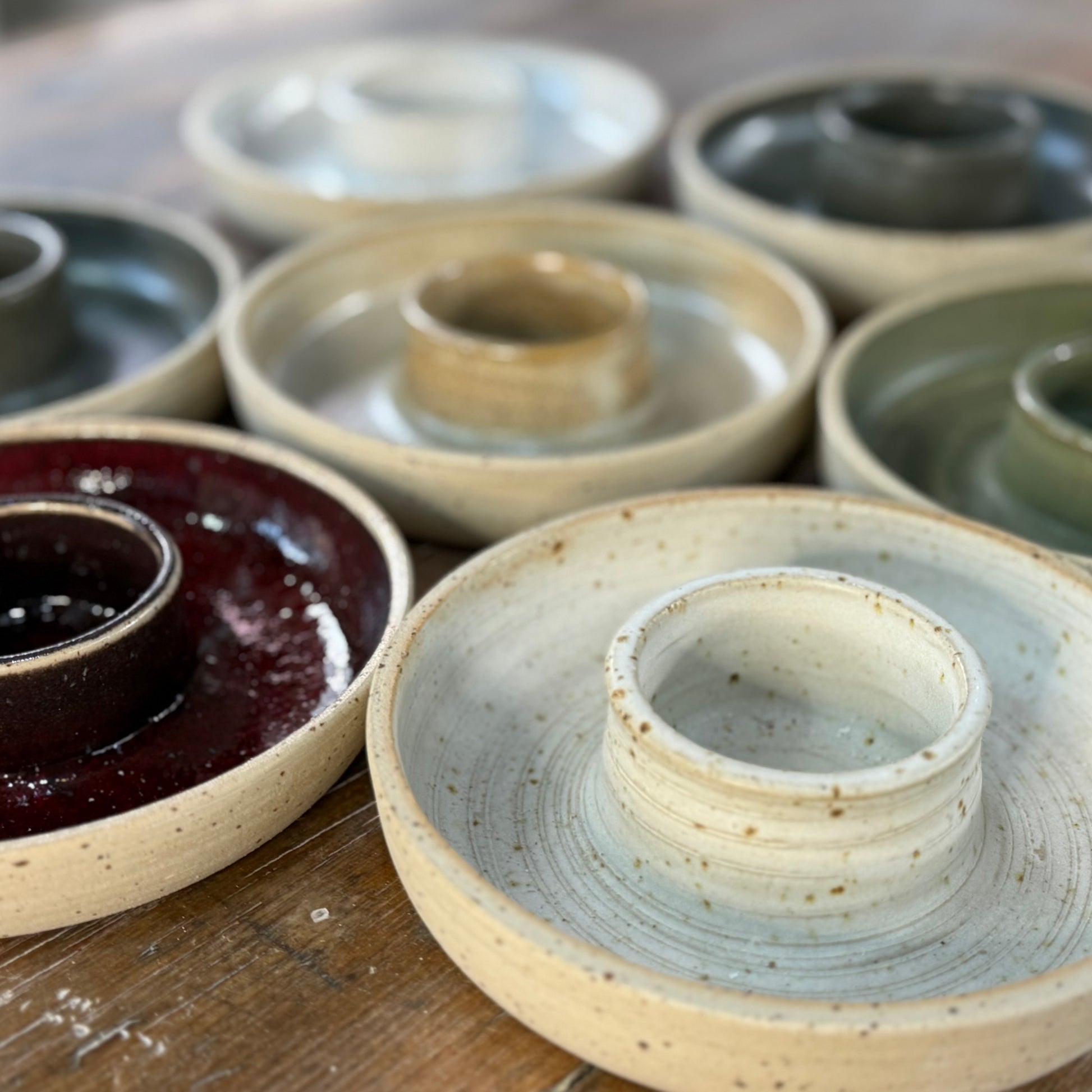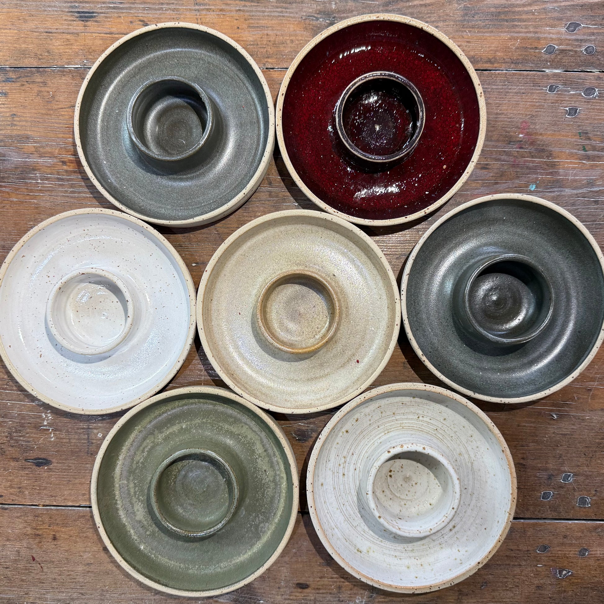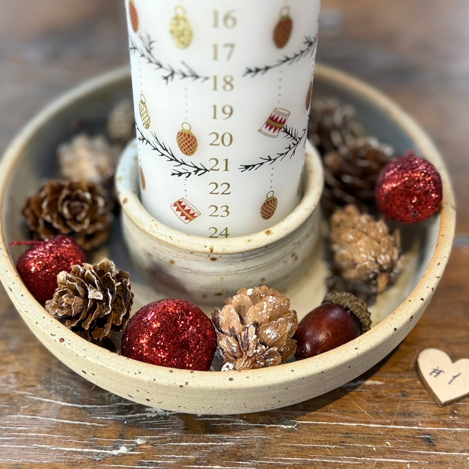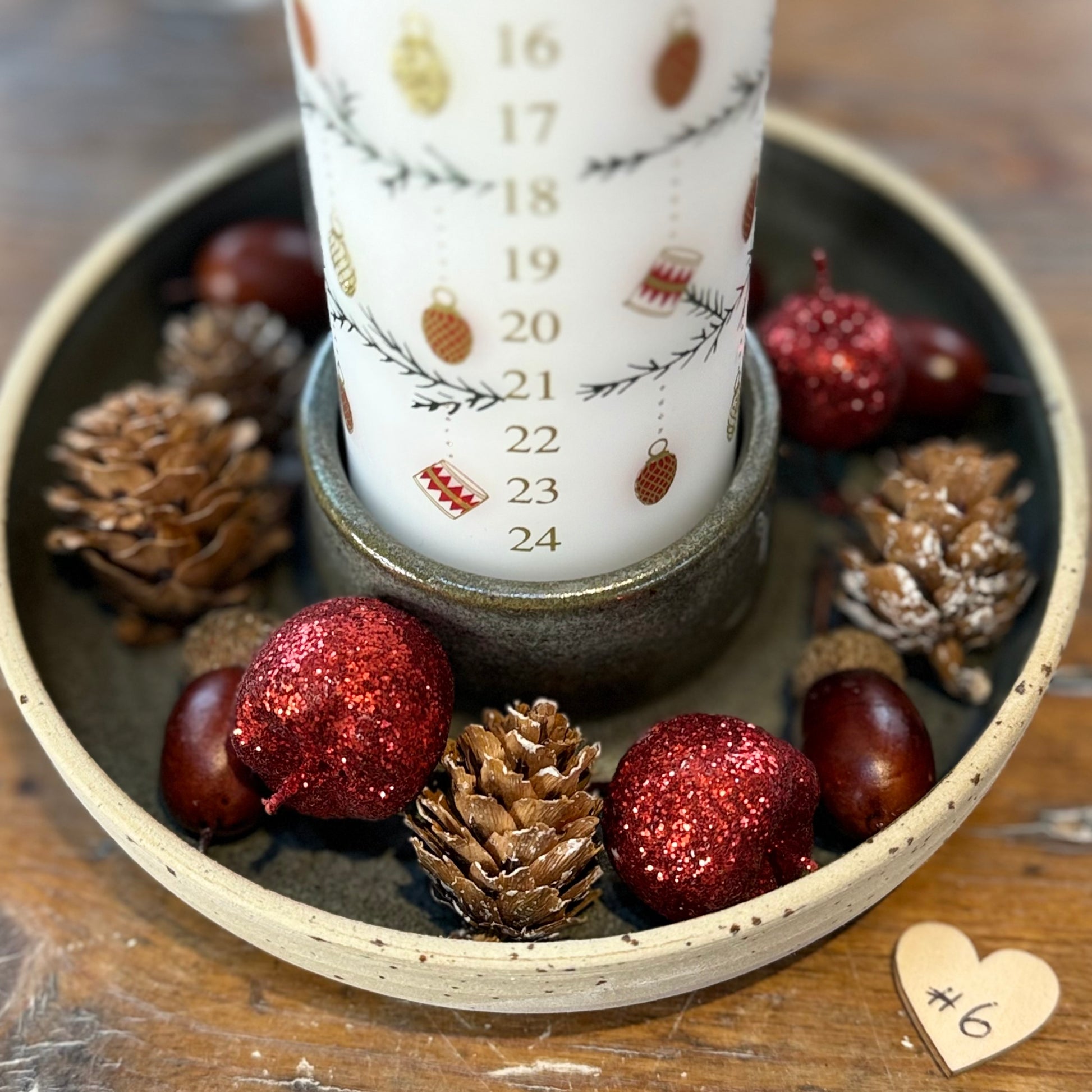 Lysestager til kalenderlys hvor der er plads til lidt dekoration rundt om. Lavet i stentøjsler.