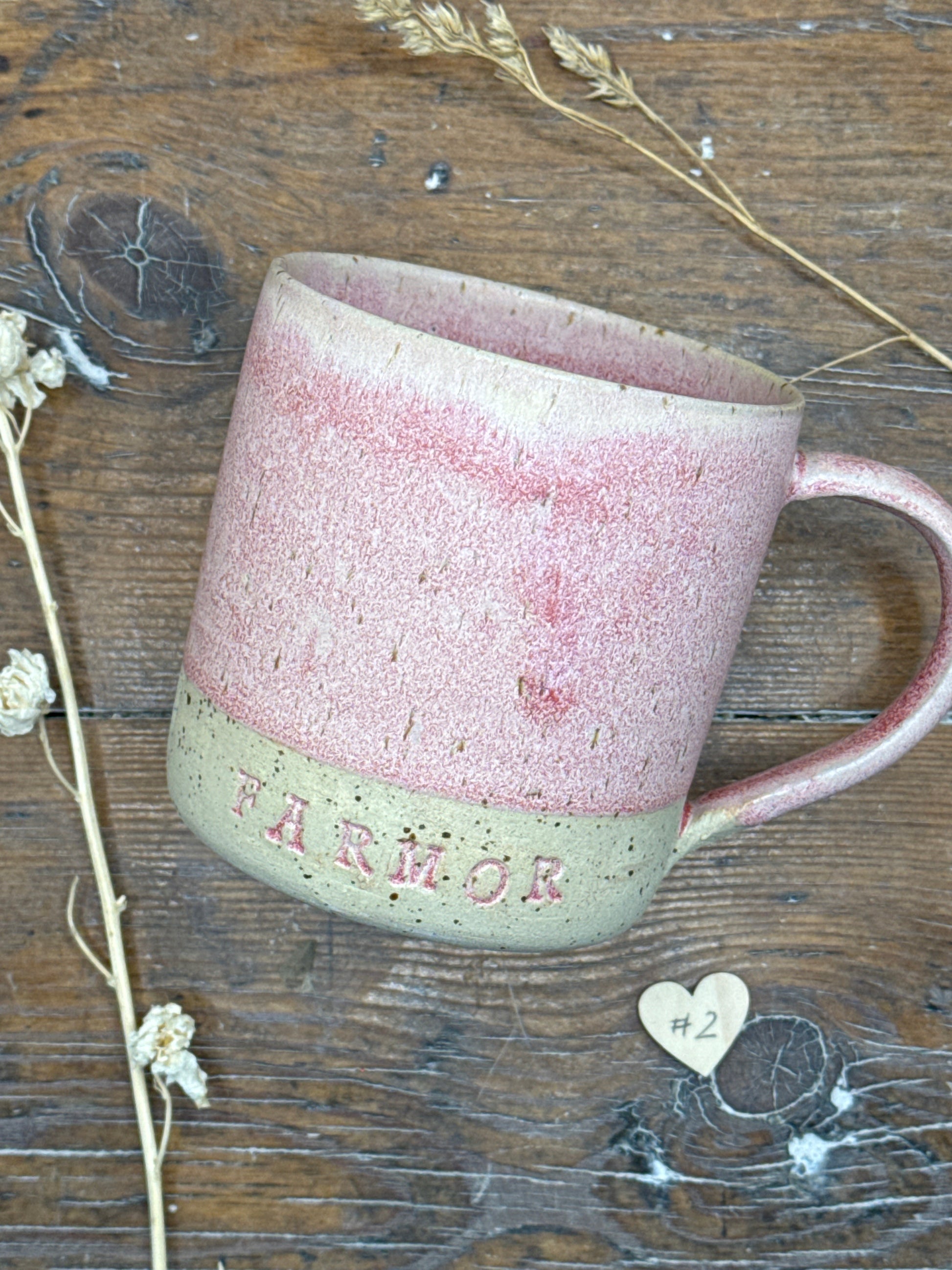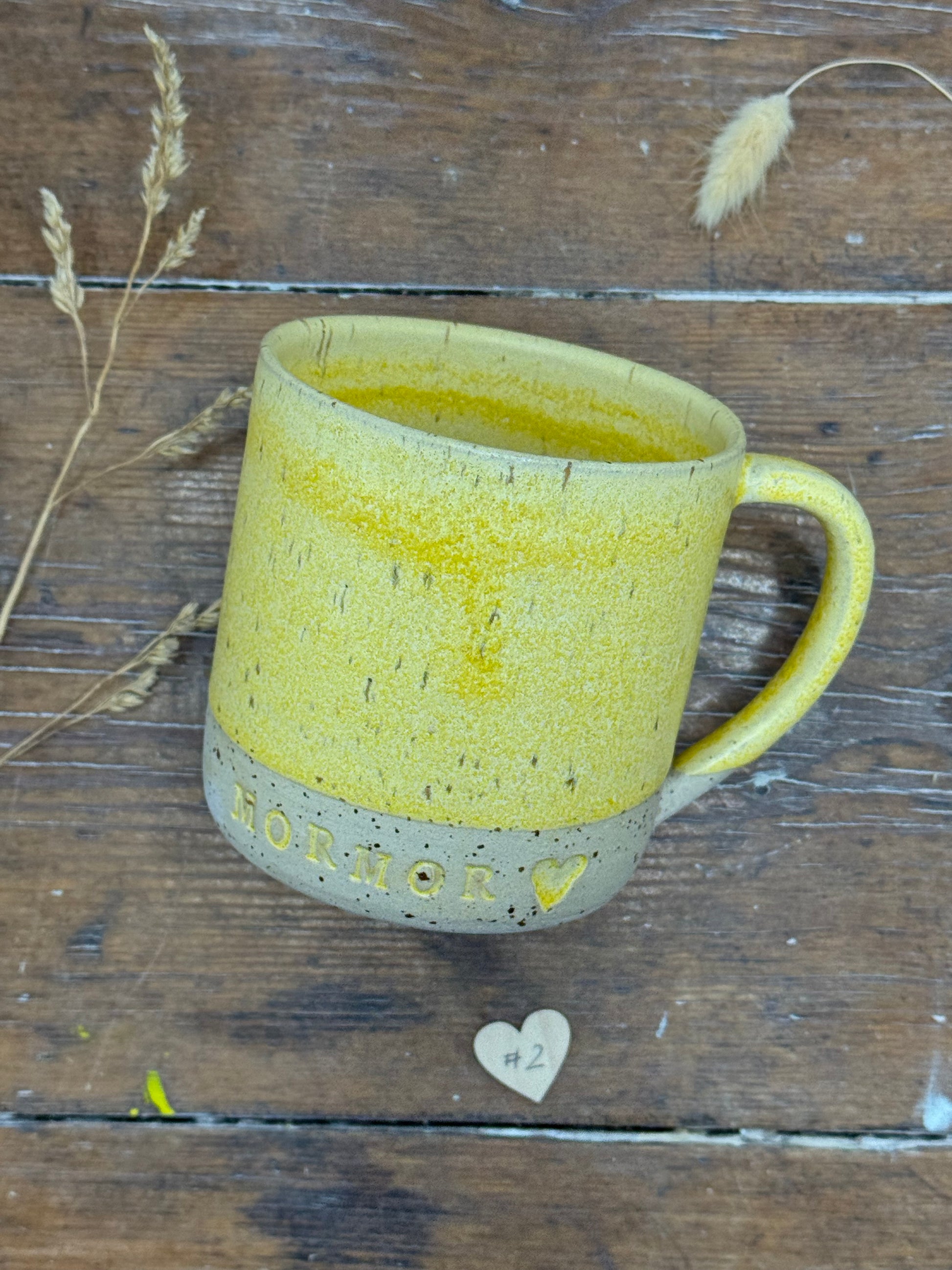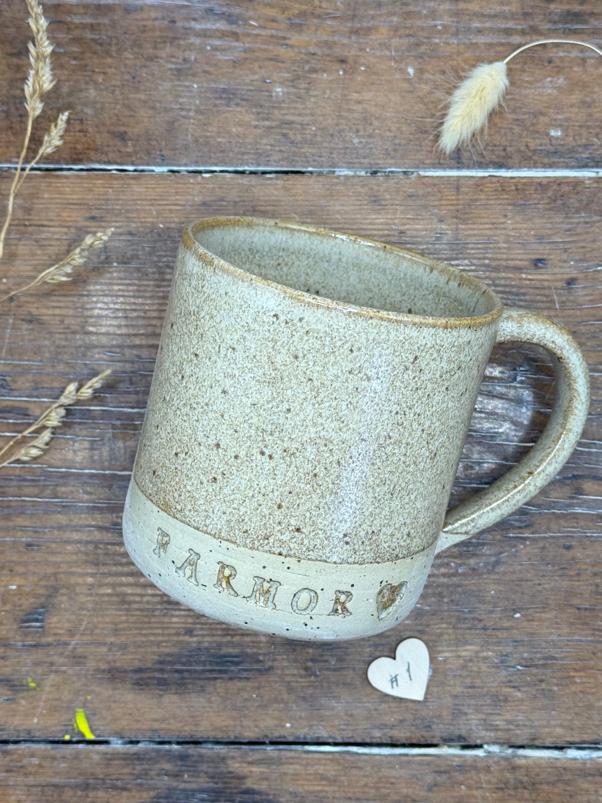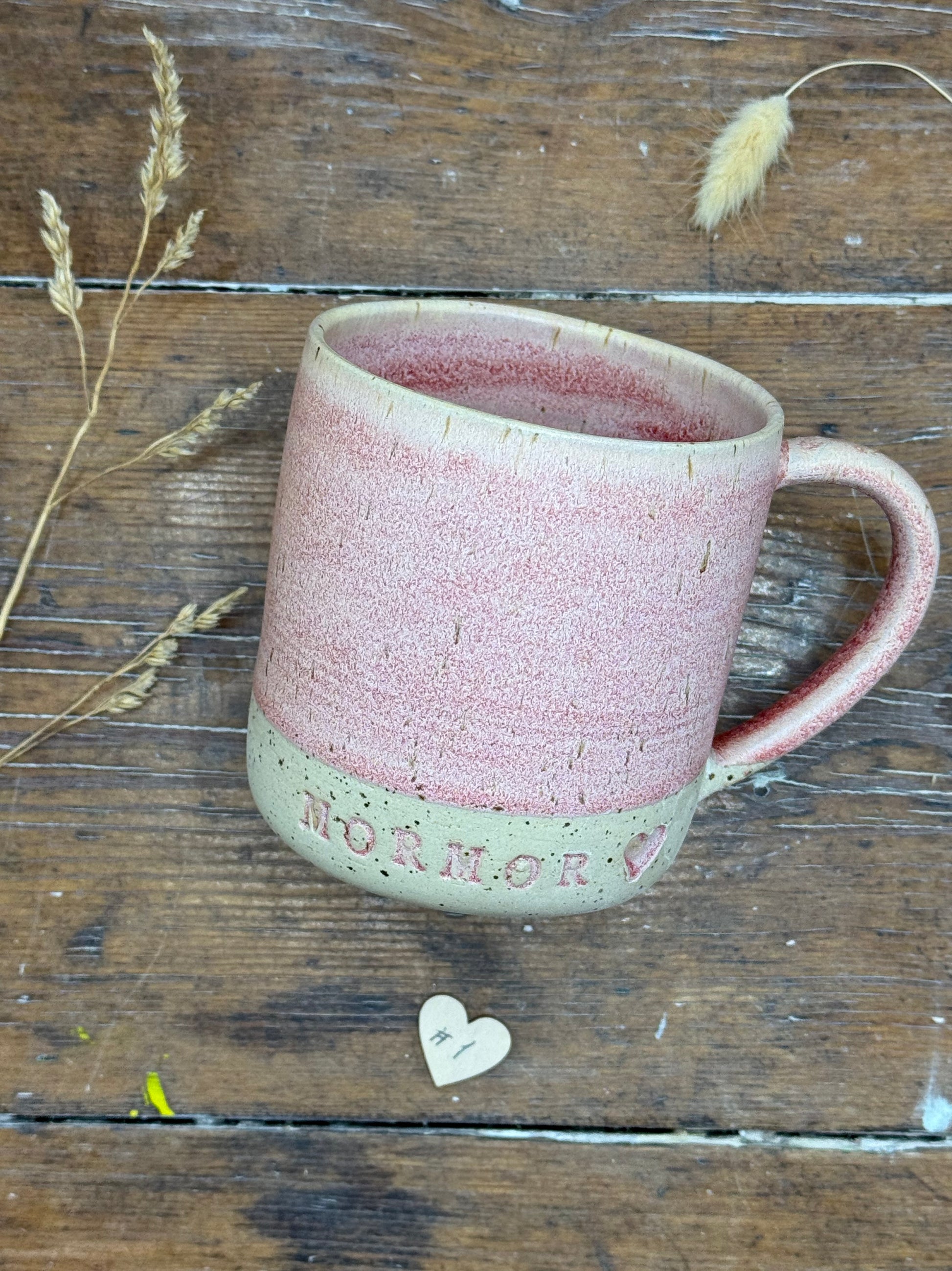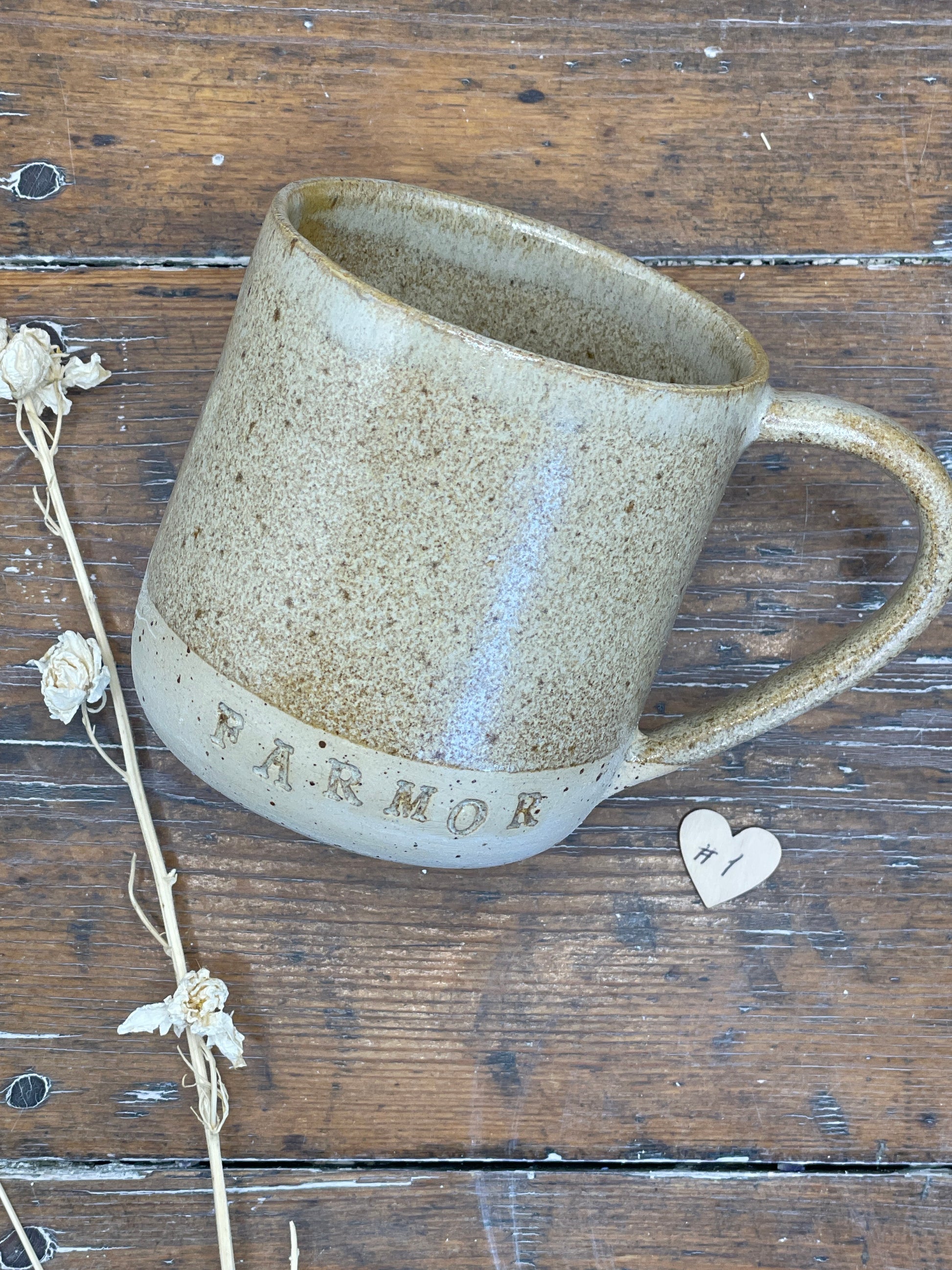 Hånddrejet krus med teksten MORMOR, MORFAR, FARMOR eller FARFAR og evt. et hjerte efter og med eller uden hank.