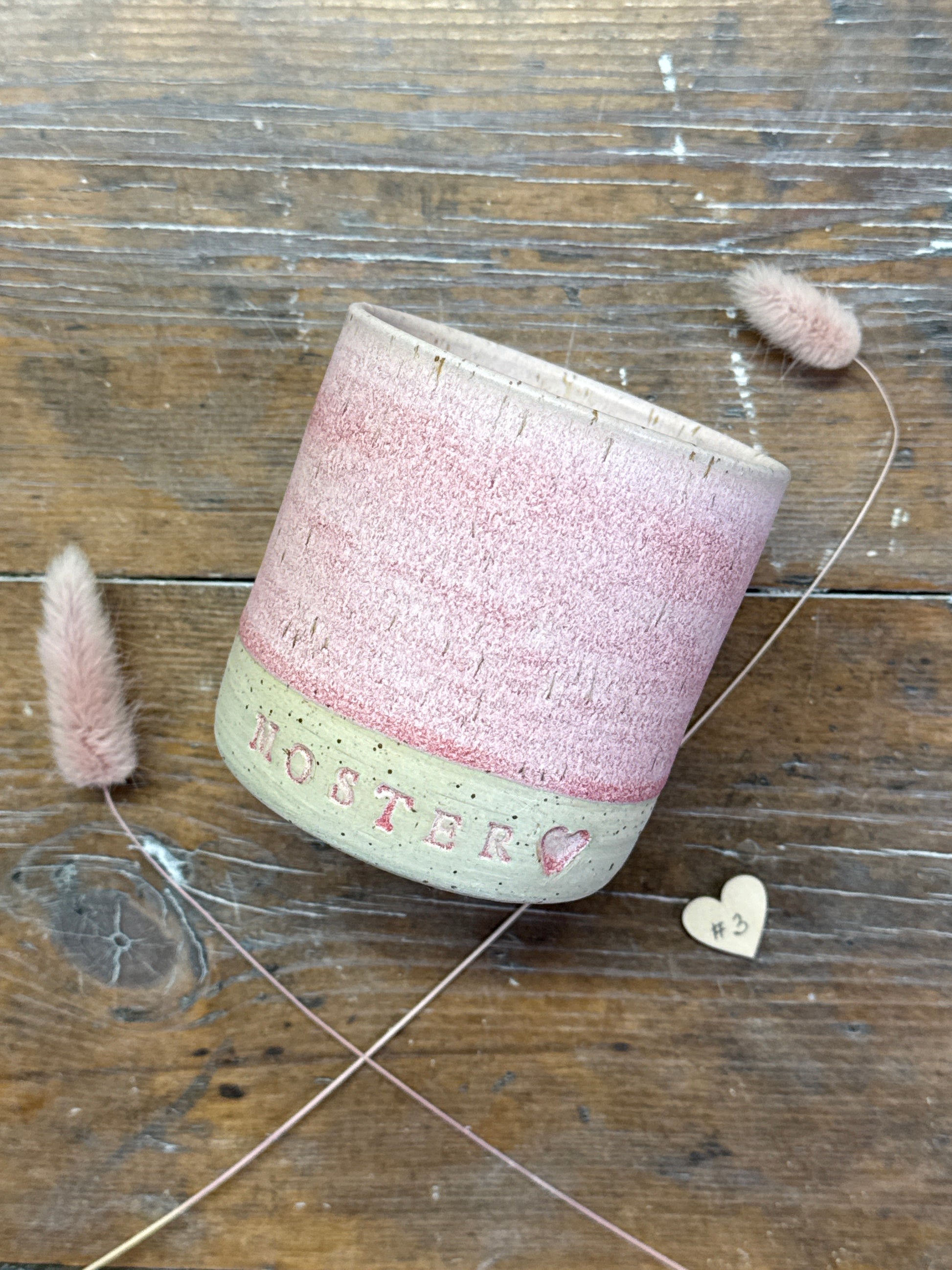 Hånddrejet krus med teksten MOSTER og evt. et hjerte efter og med eller uden hank. Krusene er lavet i stentøjsler og kan indeholde cirka 3 dl. væske.