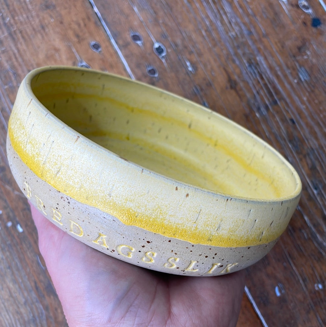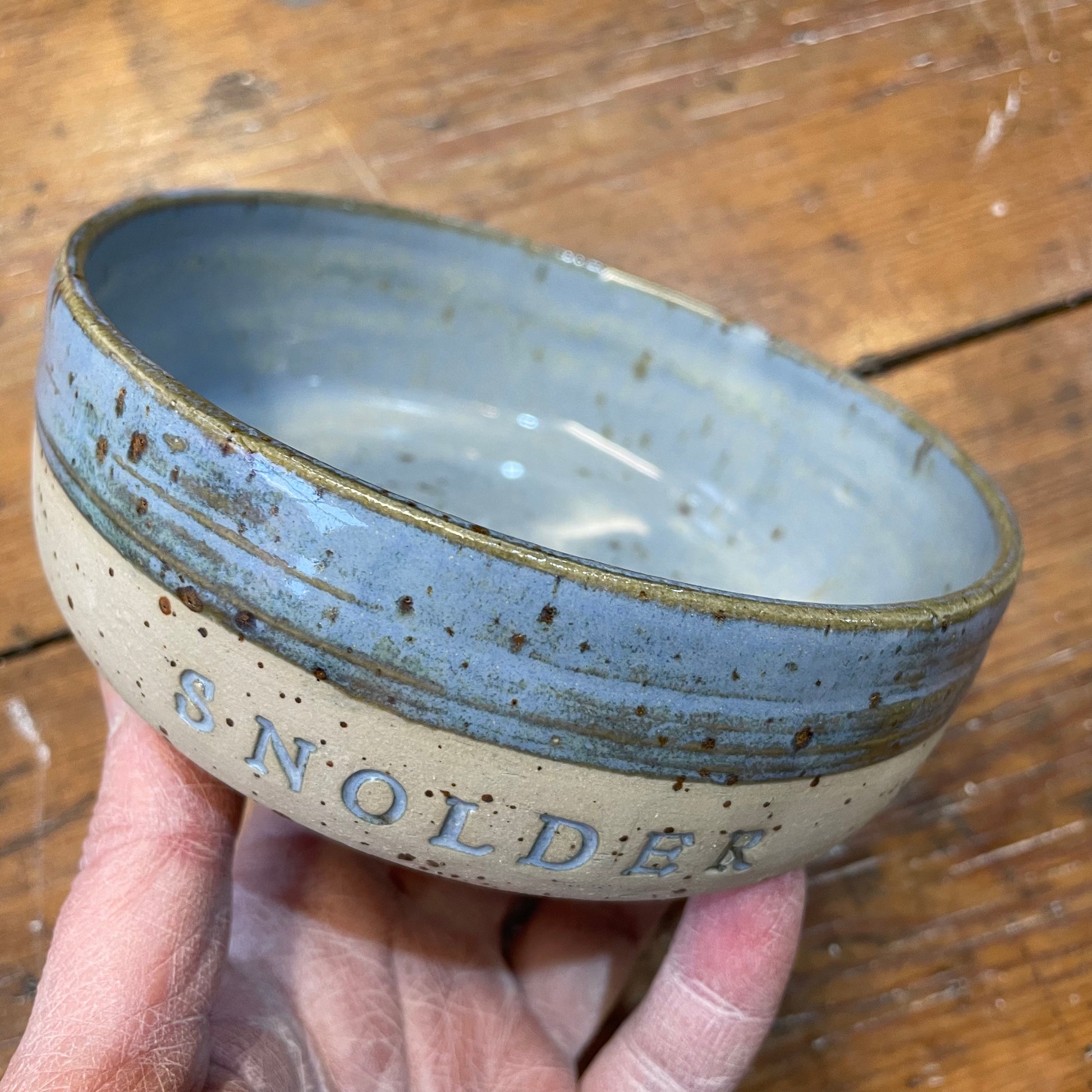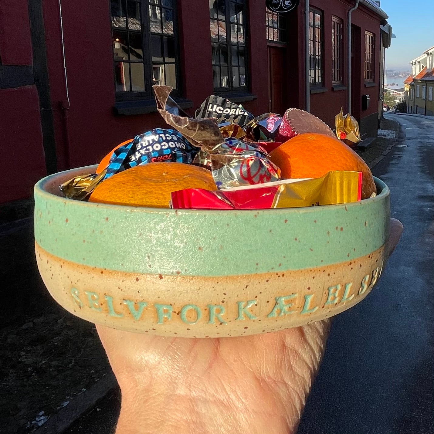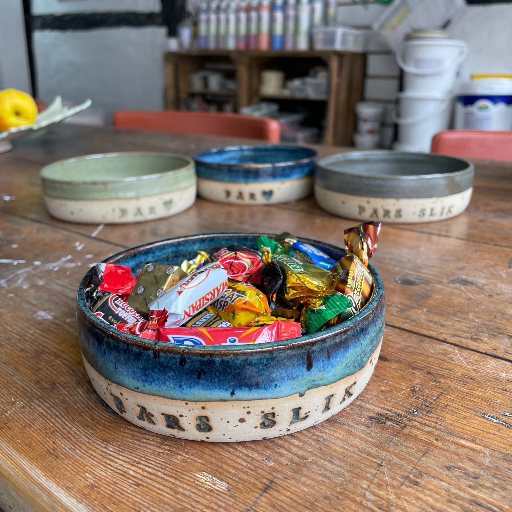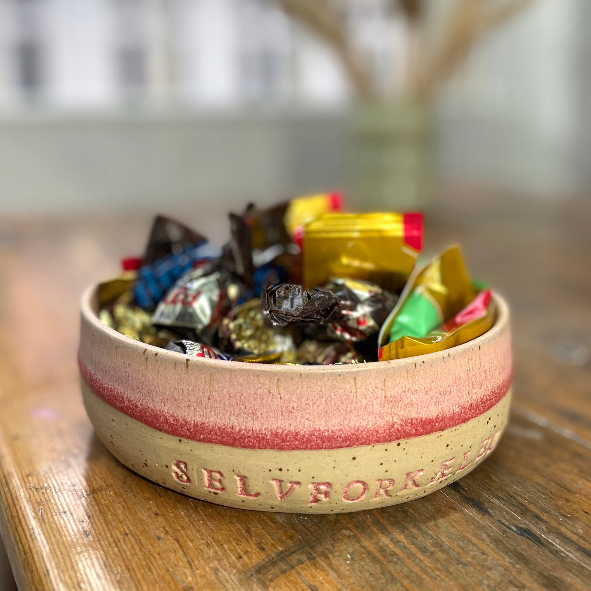 Hånddrejet skål i stentøjsler med mange anvendelsesmuligheder, men oplagt til fredagsslik og snacks. Skålen er cirka 13-14 cm i diameter og 4-4,5 cm høj.