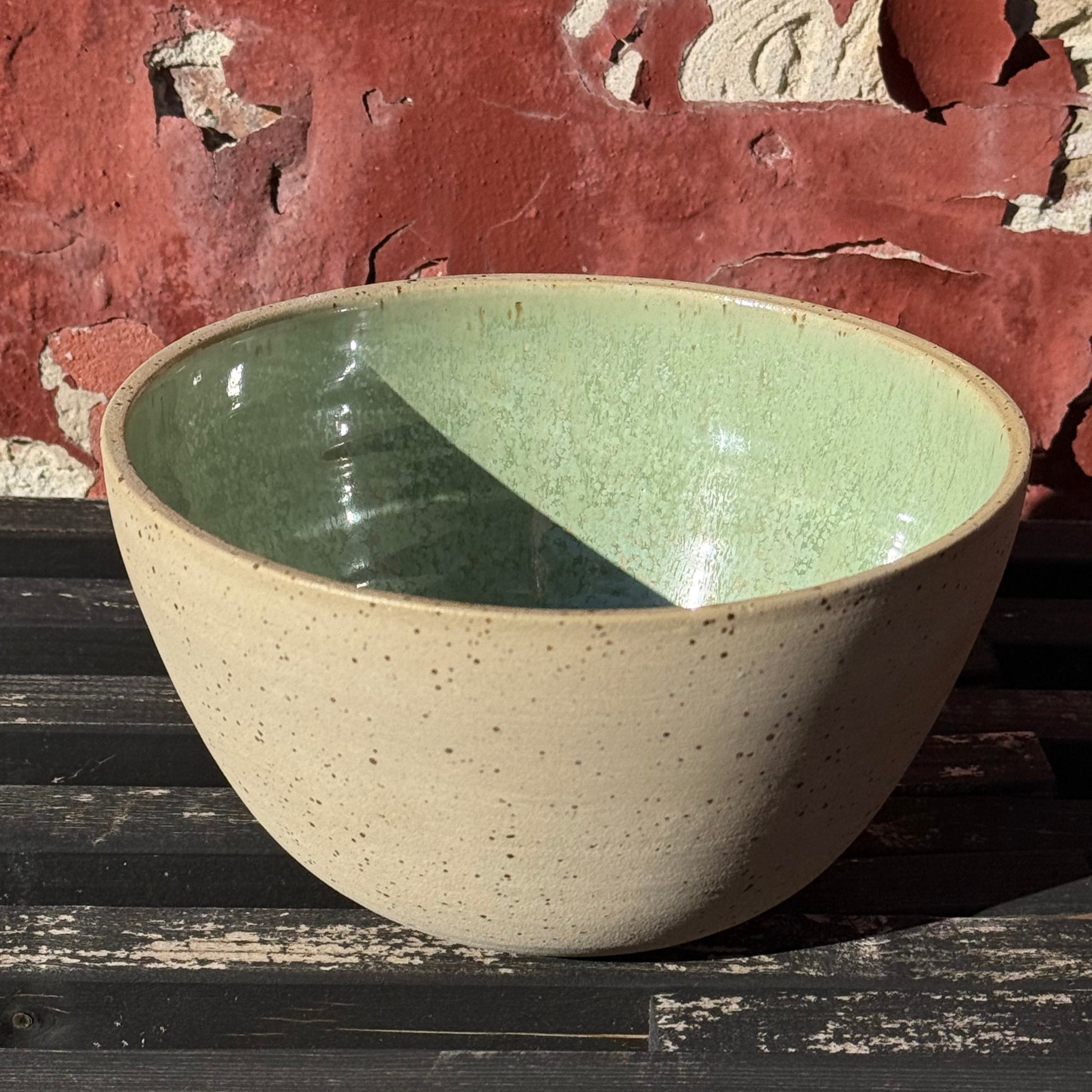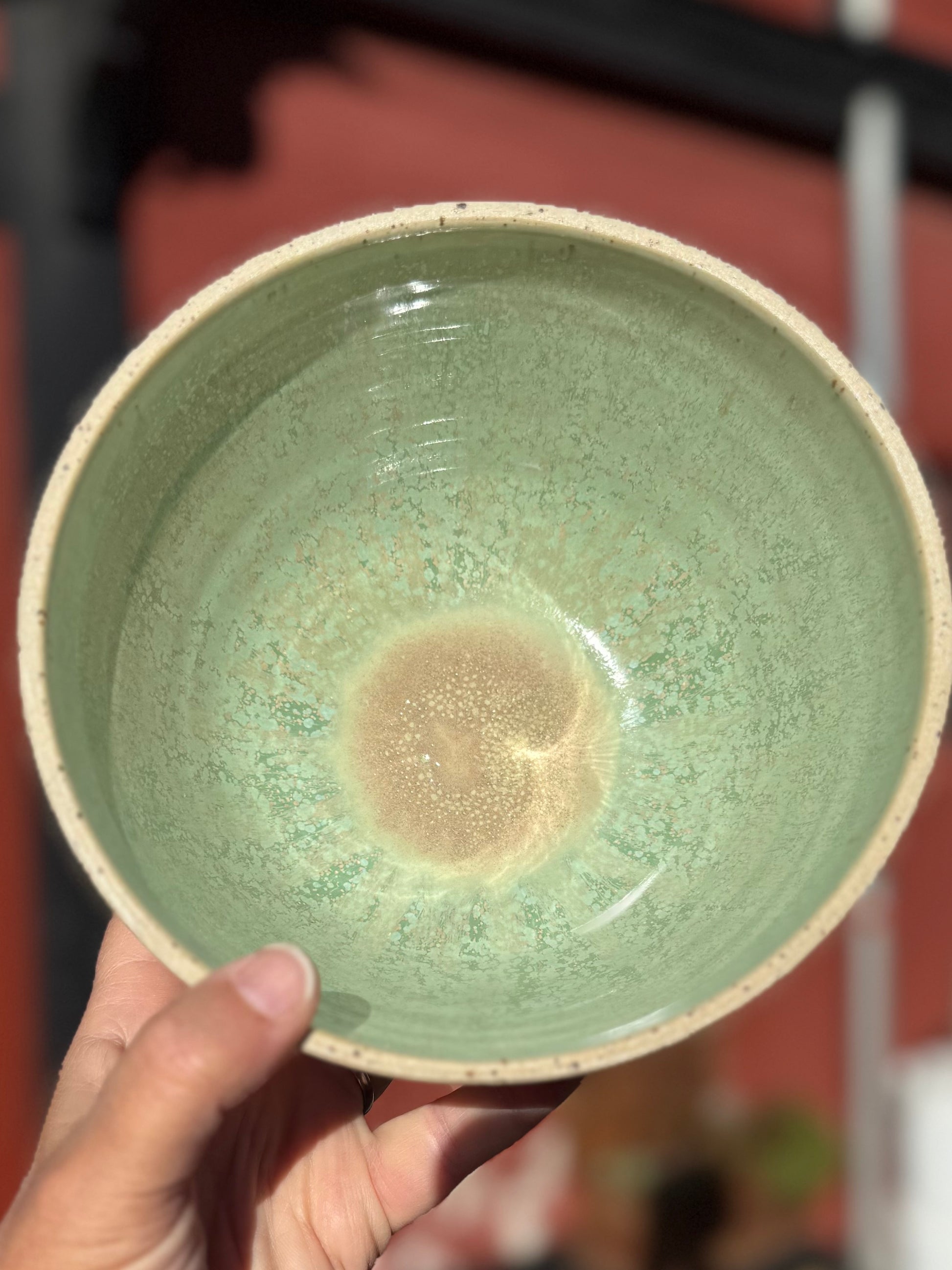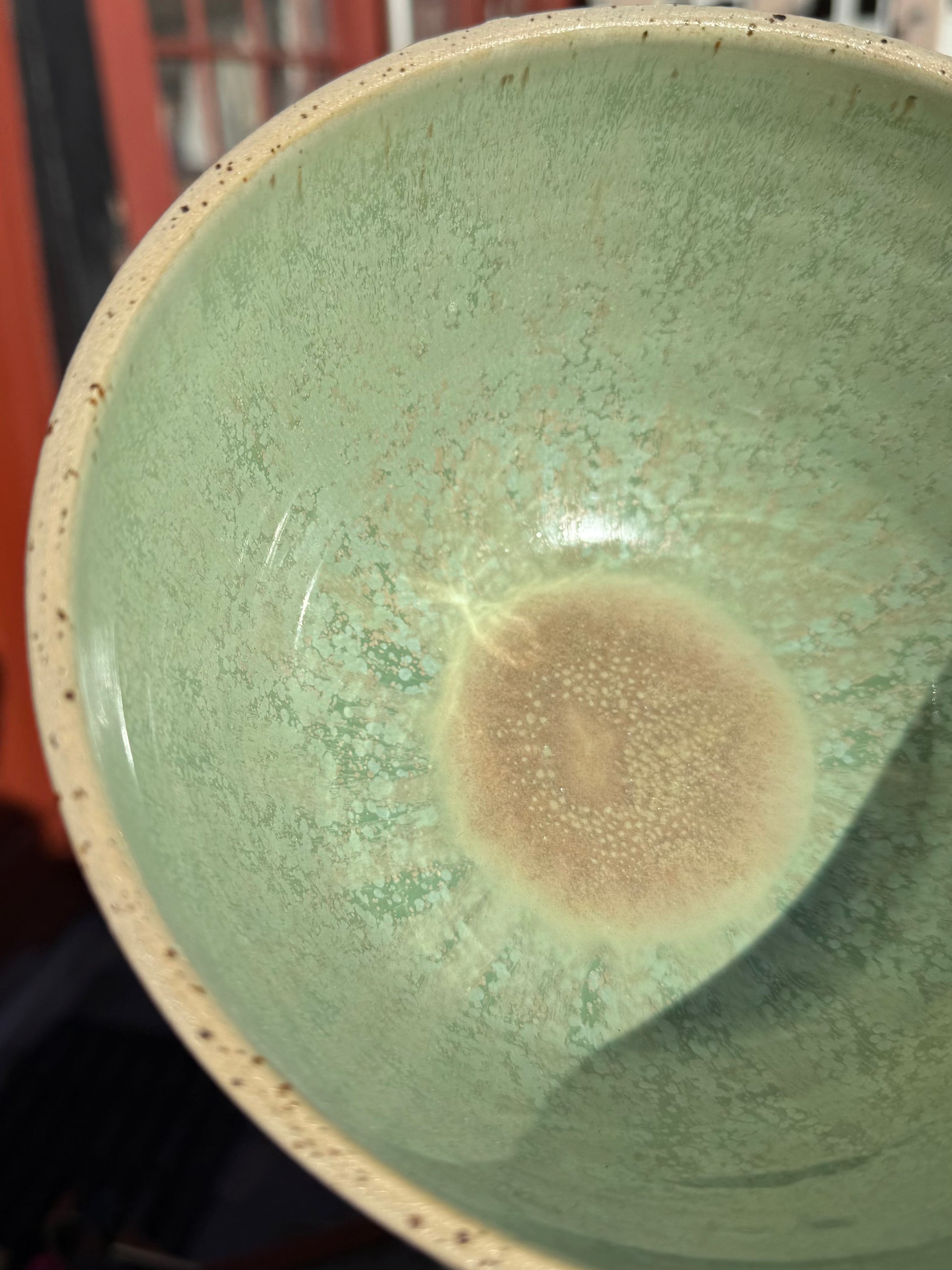 Lækker stentøjsskål med flot grønlig glasur med mange fine krystaller.
