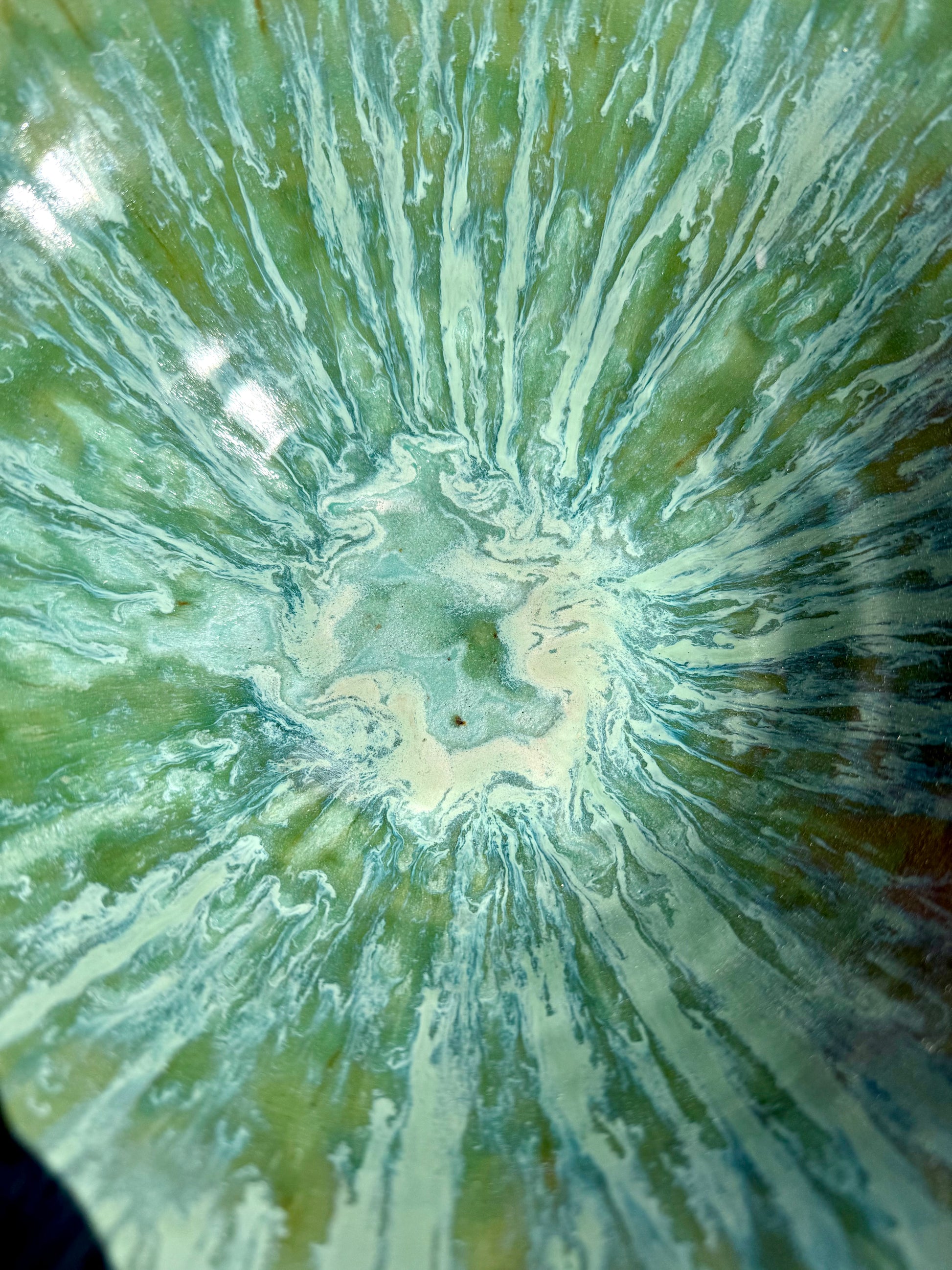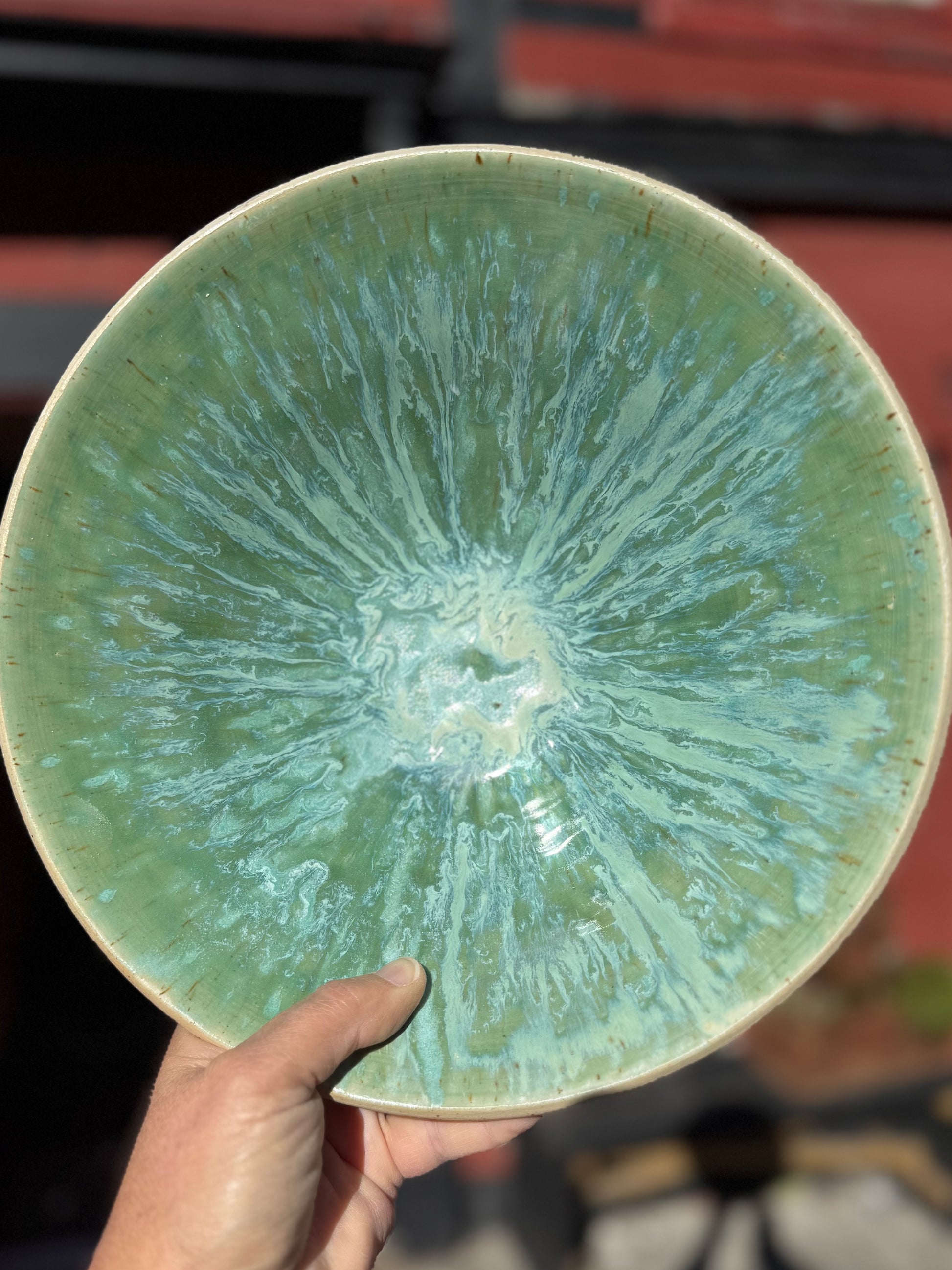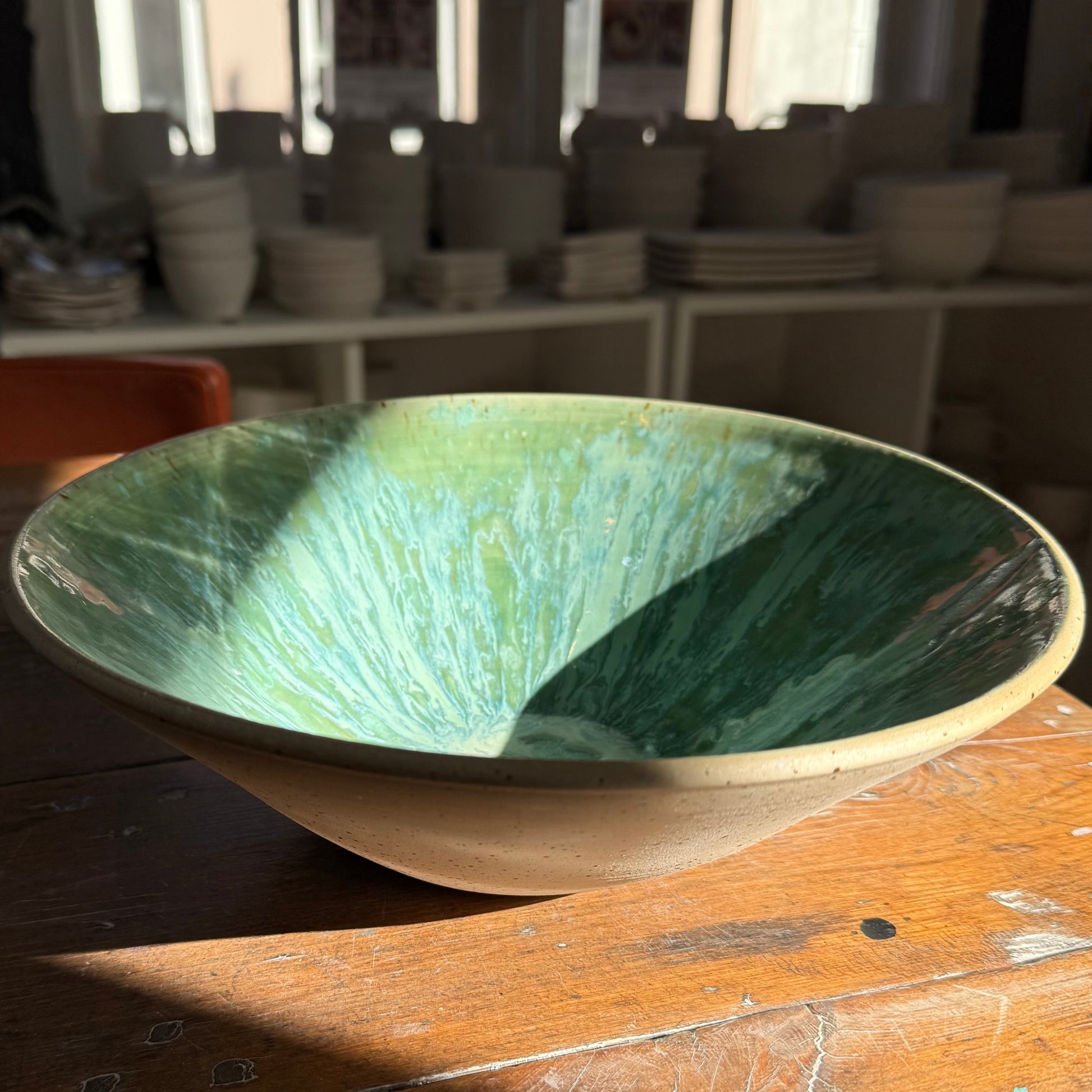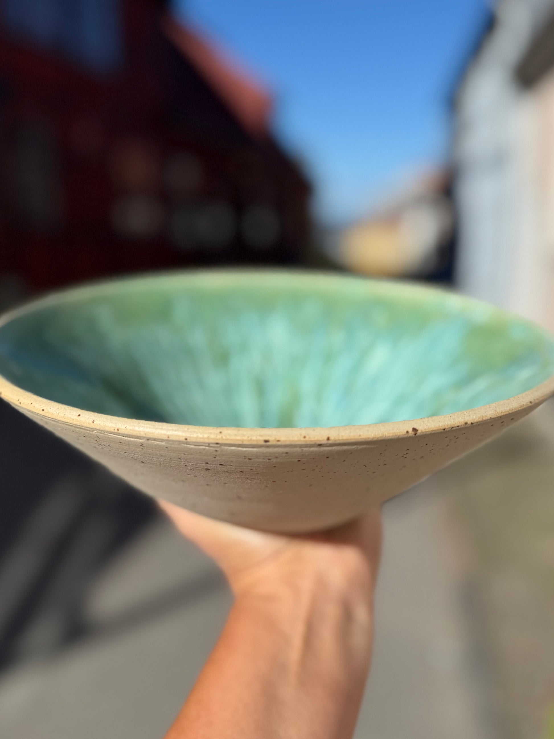Lækker stor stentøjsskål i flot grøn glasur med masser af grøn/blå/hvid farvespil.