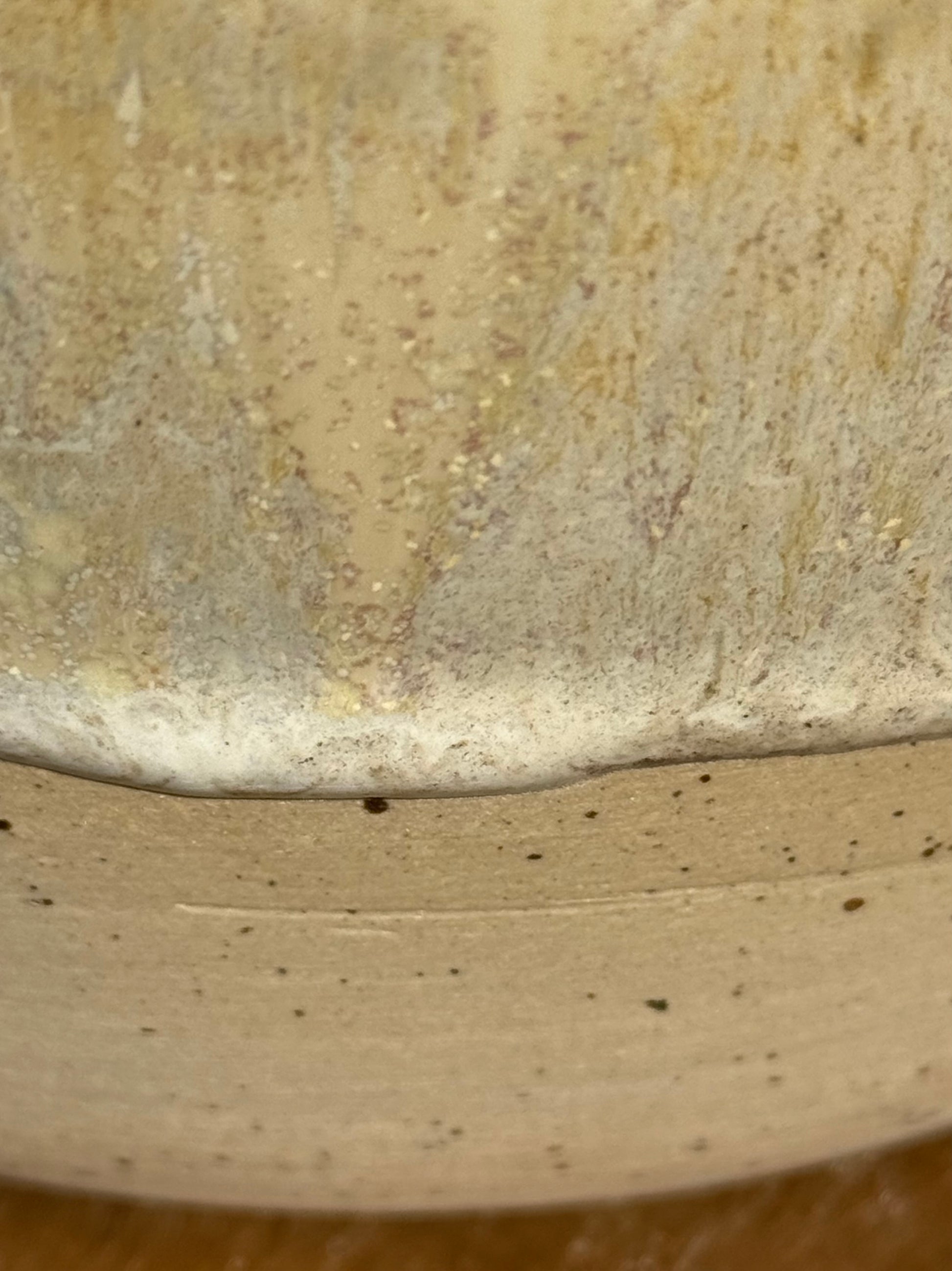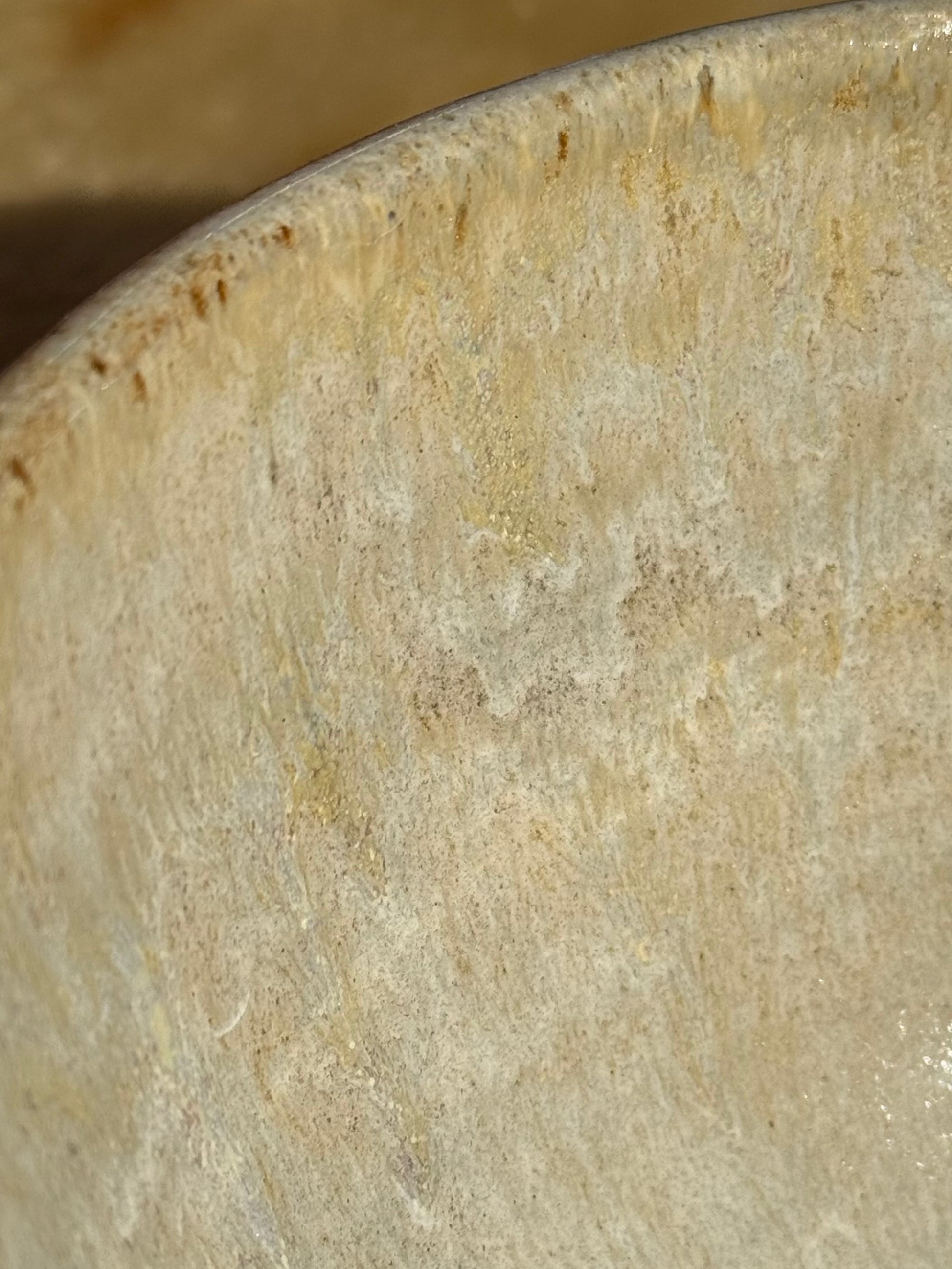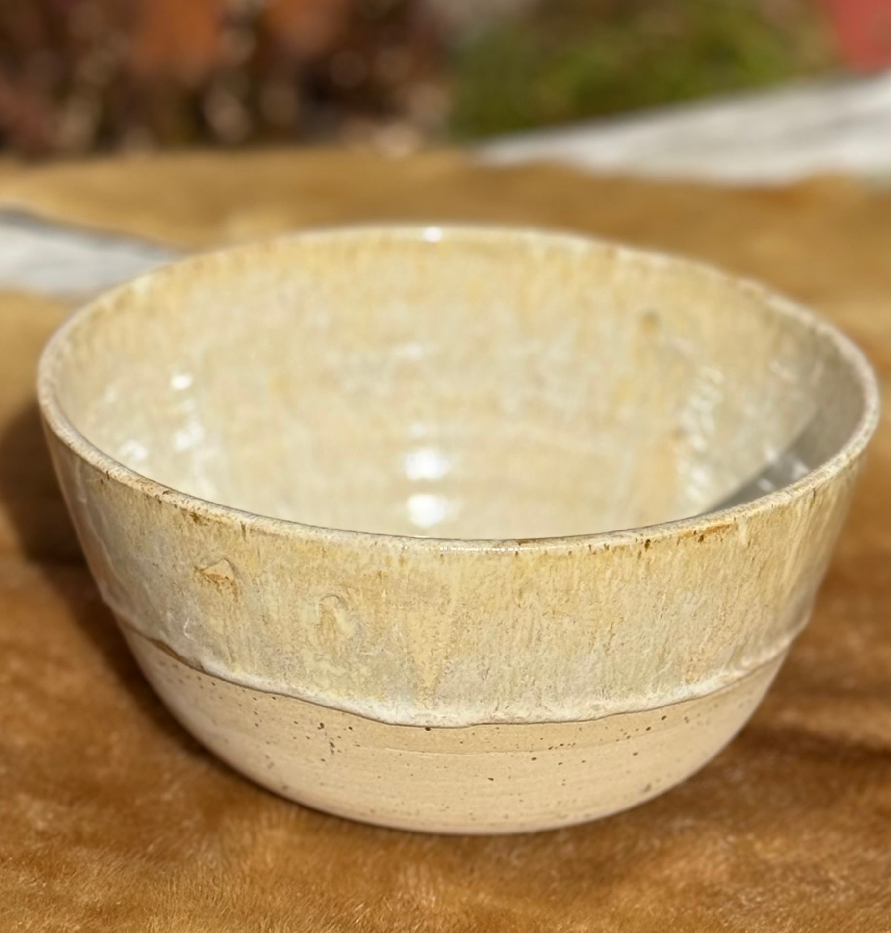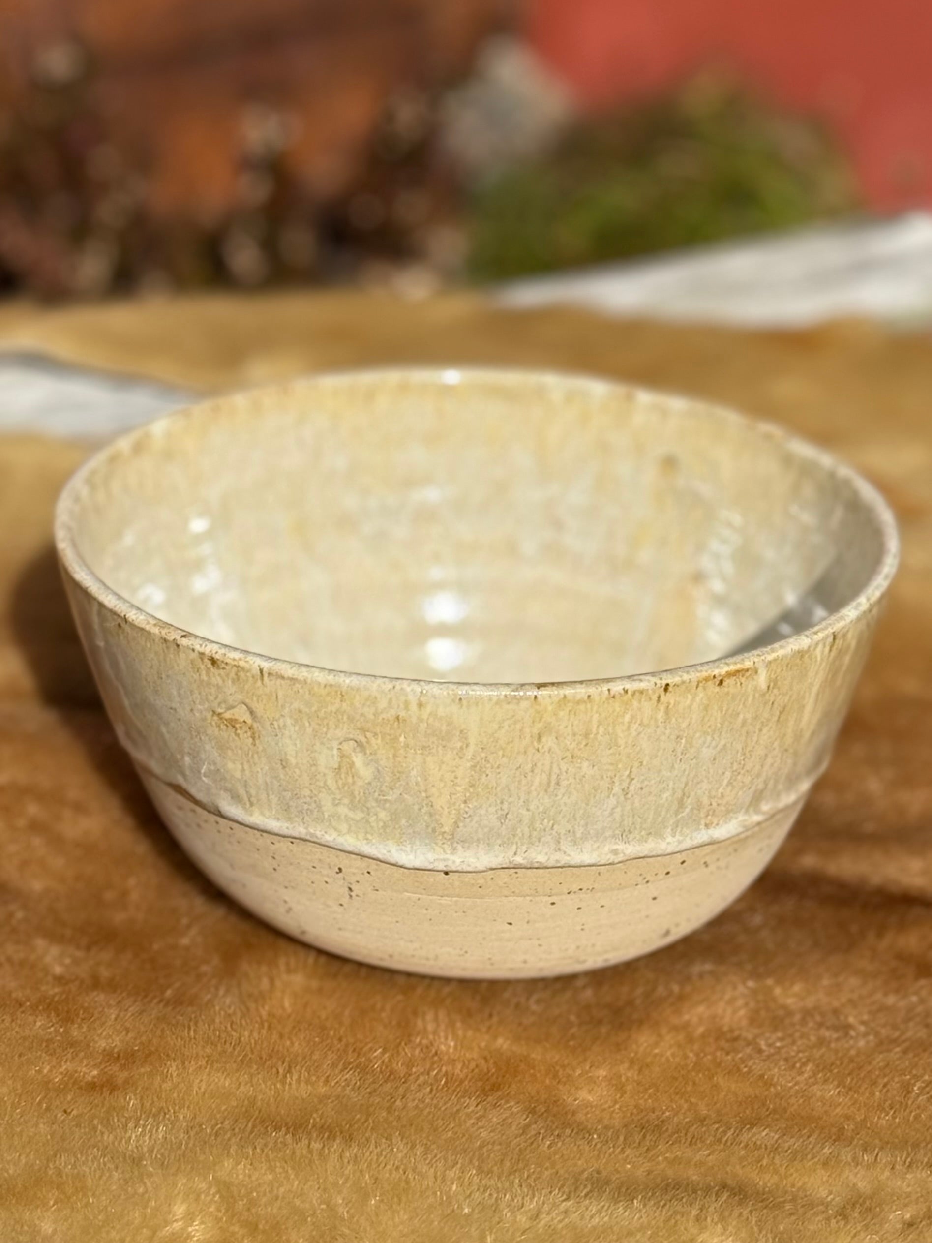 Lækker stentøjsskål med en flot blank glasur ala elfenbensfarve med masser af spil i glasuren.