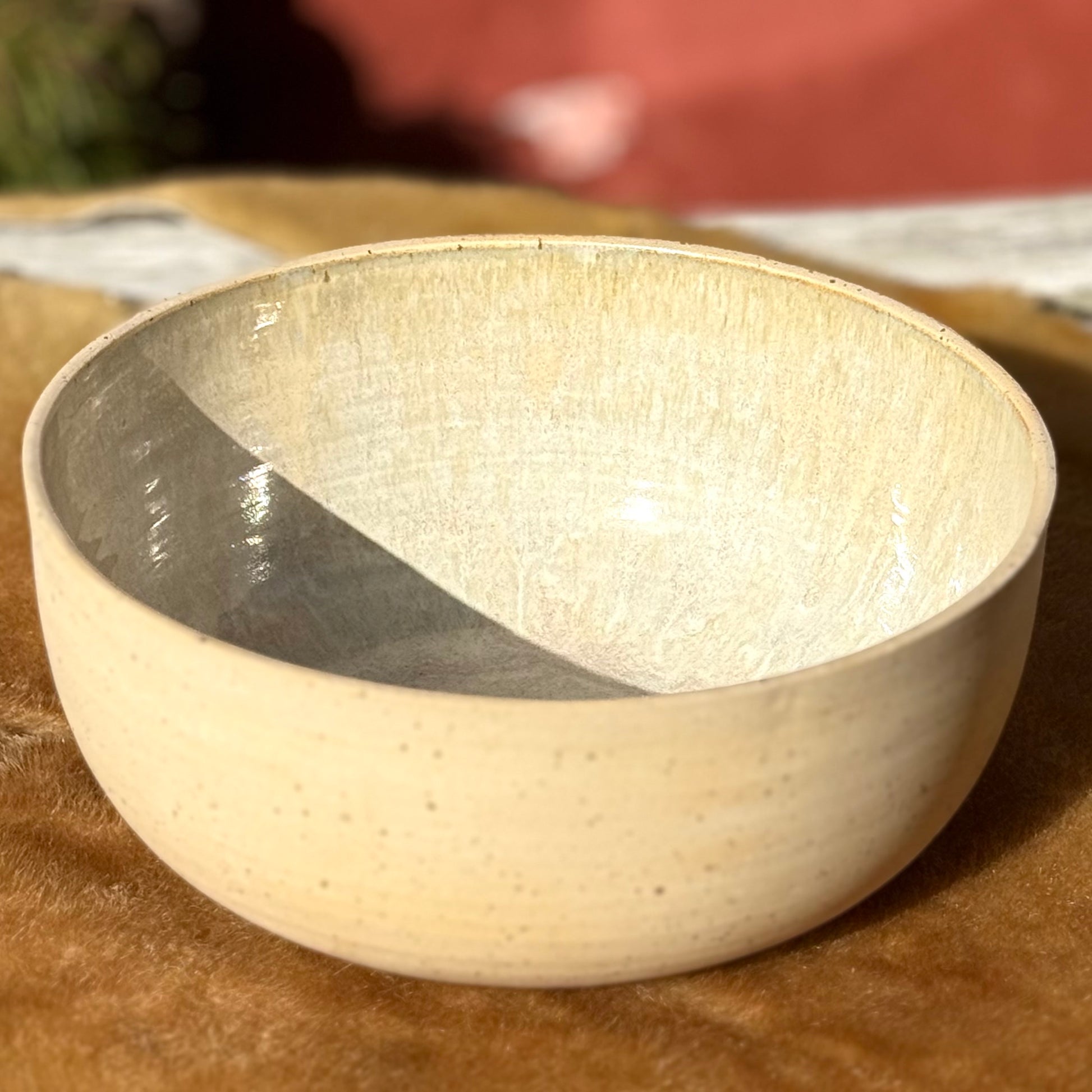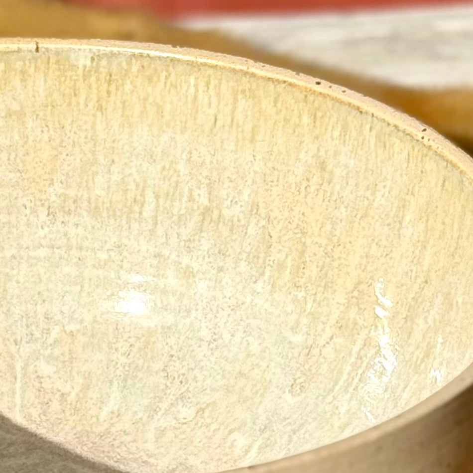 Lækker stentøjsskål med en flot blank varm lysbeige glasur med masser af spil i glasuren.