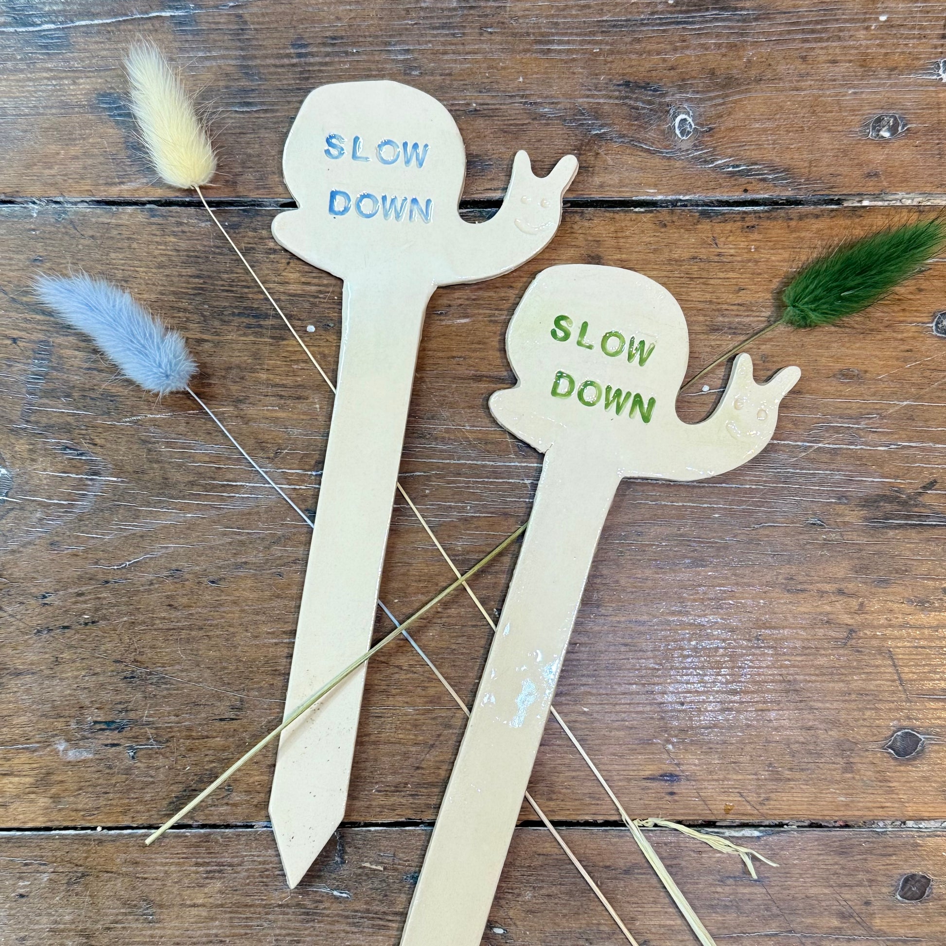 Sæt tempoet ned med en påmindelse fra disse snegle-pinde lavet i lertøjsler (glaseret på begge sider).