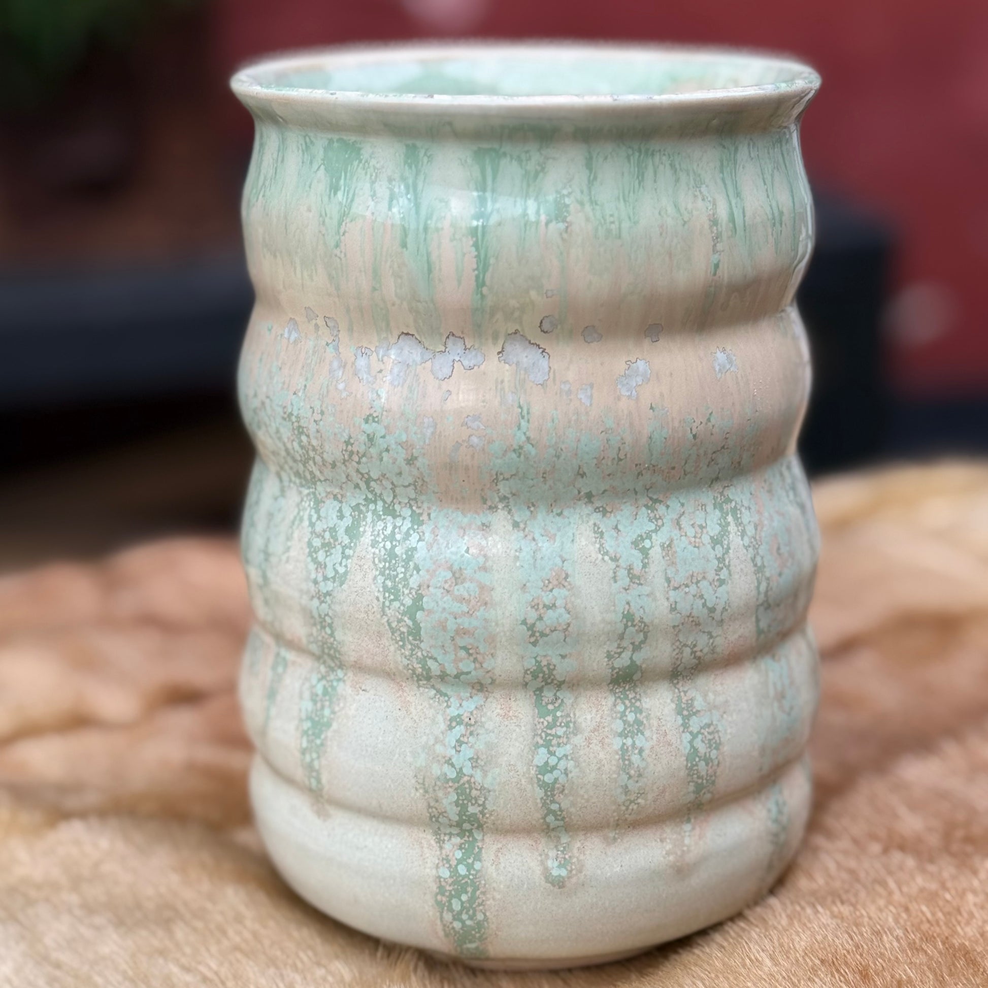 Flot, funktionel og unik hånddrejet stentøjsvase med løbekrystalglasur.